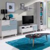 Sparta è una composizione per arredare la tua zona giorno con mobili pratici e distinti dall’avvicendarsi di colori armonici, con variante più scura o più chiara. Sparta è formata da mobile porta tv divisa da anta, cassetto e vano a giorno, cassettiera 4 cassetti, una mensola con due ripiani e mobile alto formato da 3 ante e 6 vani a giorno. Scegli la tua combinazione di colori preferita, tra toni chiari come celeste associato al oak white oppure una versione con bianco opaco abbinato al grigio e finitura naturale oak.