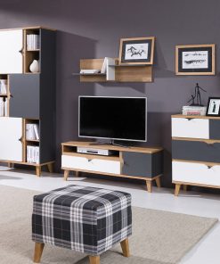 Sparta è una composizione per arredare la tua zona giorno con mobili pratici e distinti dall’avvicendarsi di colori armonici, con variante più scura o più chiara. Sparta è formata da mobile porta tv divisa da anta, cassetto e vano a giorno, cassettiera 4 cassetti, una mensola con due ripiani e mobile alto formato da 3 ante e 6 vani a giorno. Scegli la tua combinazione di colori preferita, tra toni chiari come celeste associato al oak white oppure una versione con bianco opaco abbinato al grigio e finitura naturale oak.