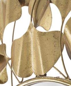 Specchio da parete tondo con ampia cornice composta da una serie di foglioline realizzate in metallo colore oro e in tridimensionale.