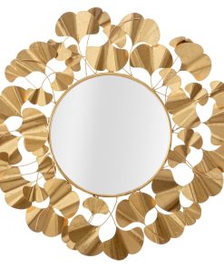 Specchio da parete tondo con ampia cornice composta da una serie di foglioline realizzate in metallo colore oro e in tridimensionale.