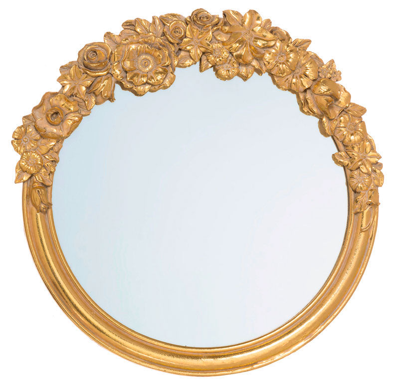 Classico specchio da parete caratterizzata dalla particolare cornice con modanature, verniciata di coloro oro. Per valorizzare questo specchio tondo potete scegliere mobili dal design essenziale e materiali naturali come il legno.