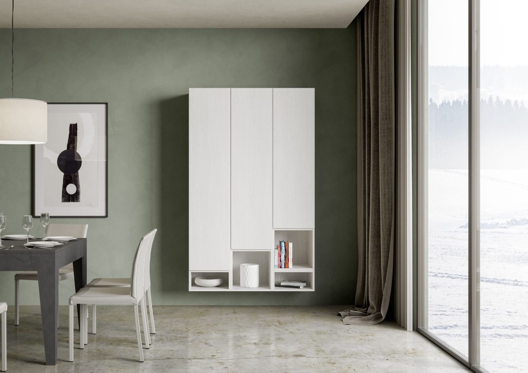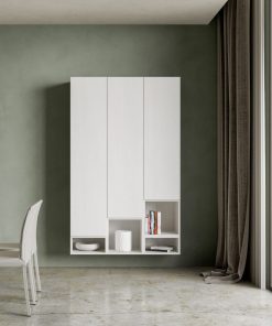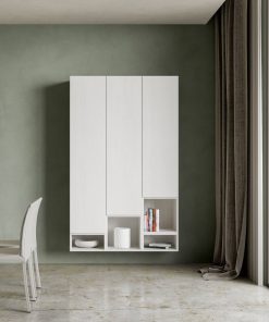 Parete moderna Stefy, un’idea intrigante per arredare la zona giorno, dotandola di 3 pensili verticali e di vani a giorno, uniti nella composizione suggerita, ossia perfettamente affiancati tra loro. I pensili della parete living Stefy essendo separati, potranno essere disposti in maniera differente da quella proposta. Inoltre, può diventare anche un’idea utile per attrezzare l’ingresso.
