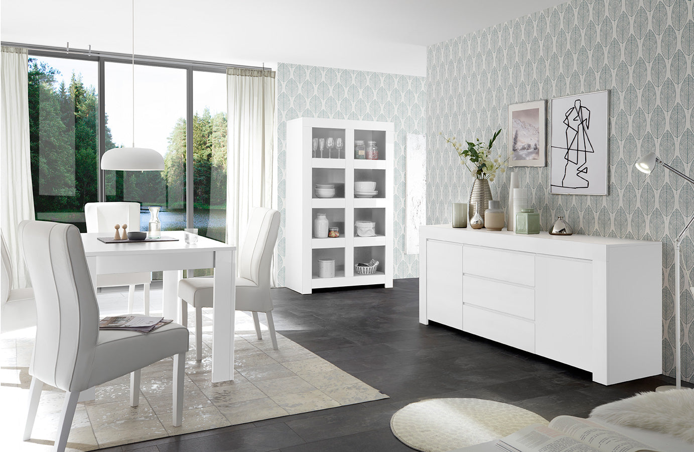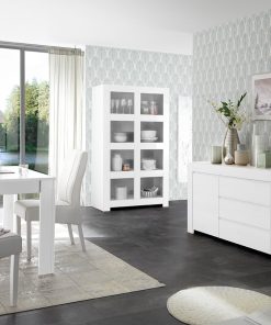 Sala da pranzo moderno Strasburgo composto da credenza da cm 184, tavolo da pranzo da cm 137 estensibile a cm 185 e scaffale ampio e alto. I mobili del nostro set living sono realizzati in legno, seguendo una progettazione e lavorazione tutta italiana.