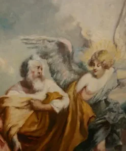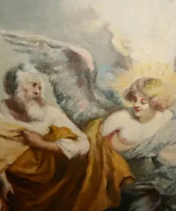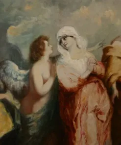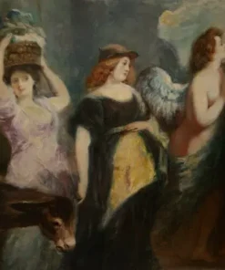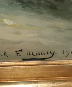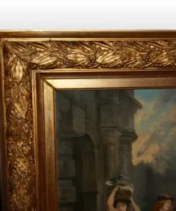 Maestoso olio su tela francese datato e firmato 1901 in basso a destra F. Maury (1861-1933), raffigurante l’entrata della Madonna Vergine Maria e San Giuseppe nella città di Betlemme accompagnati da personaggi, 2 angeli e asinello; con splendida cornice dorata foglia oro.