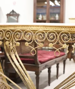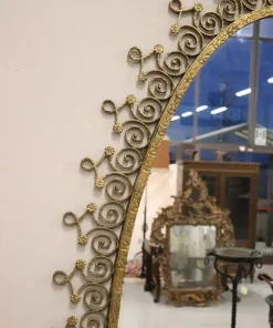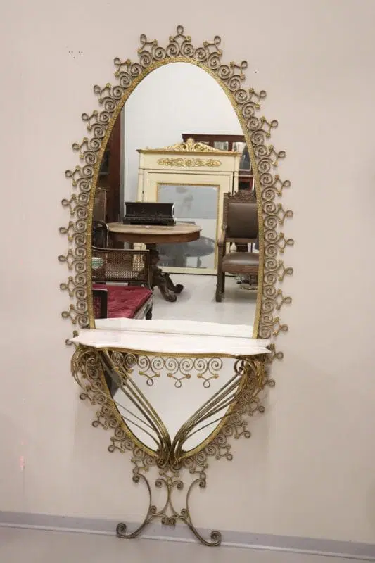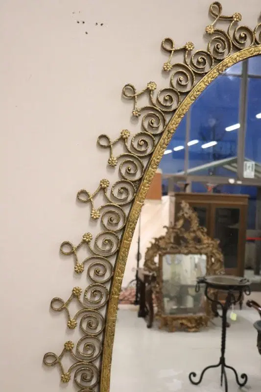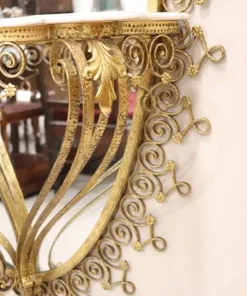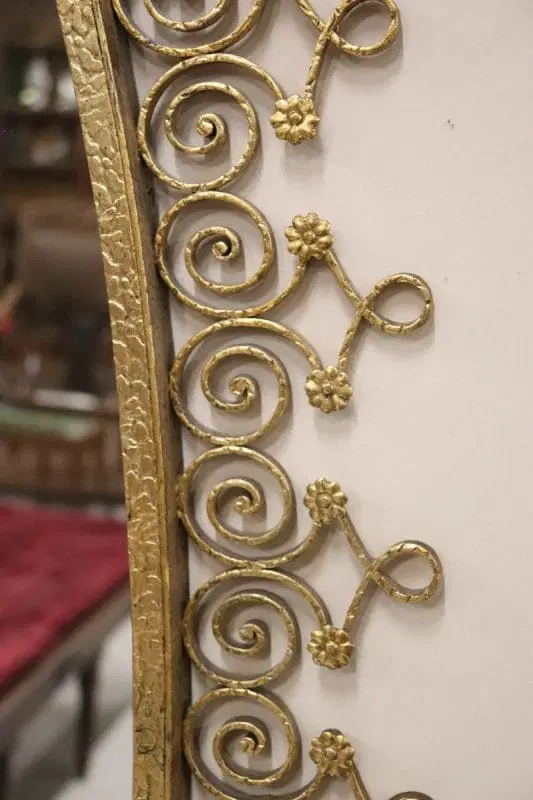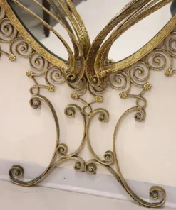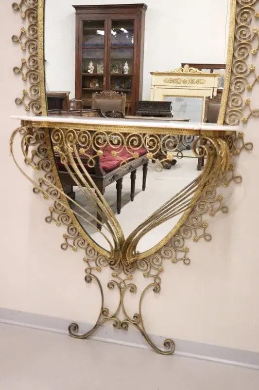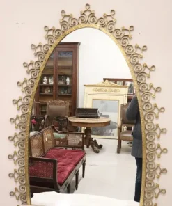 Siamo lieti di presentarvi questo splendido specchio ovale da terra, uno squisito pezzo di design italiano della metà del secolo scorso, attribuibile al talentuoso designer Pier Luigi Colli. Questo maestoso specchio presenta una cornice in ferro battuto splendidamente dorata, con un’accattivante decorazione ondulata ornata da riccioli e spirali che si susseguono elegantemente in un disegno armonioso, intervallato da delicati motivi floreali. La doratura esalta l’intricato disegno, creando un perfetto equilibrio tra opulenza e sobria eleganza. Questo specchio non è solo un elemento visivo di grande impatto, ma è anche un funzionale tavolo consolle, completo di un raffinato piano in marmo chiaro con venature rosa tenue. Questa doppia funzionalità gli consente di fungere sia da pratico tavolo d’appoggio sia da grande specchio, perfetto per i ritocchi dell’ultimo minuto o per esporre oggetti decorativi. grazie alle sue caratteristiche uniche, questo specchio è ideale per valorizzare qualsiasi ambiente della casa, che si tratti di un ingresso, di un soggiorno o di qualsiasi altro spazio che possa trarre vantaggio da un pezzo d’arredo di spicco. Si trasforma senza sforzo in un punto focale di ammirazione, invitando gli ospiti ad apprezzarne la bellezza e la maestria. Possedere questo specchio significa portare a casa un fantastico e raro esempio di design italiano di metà secolo, che lo rende un’aggiunta preziosa a qualsiasi collezione o arredamento. Non perdete l’opportunità di elevare il vostro spazio con questo straordinario pezzo d’arte.