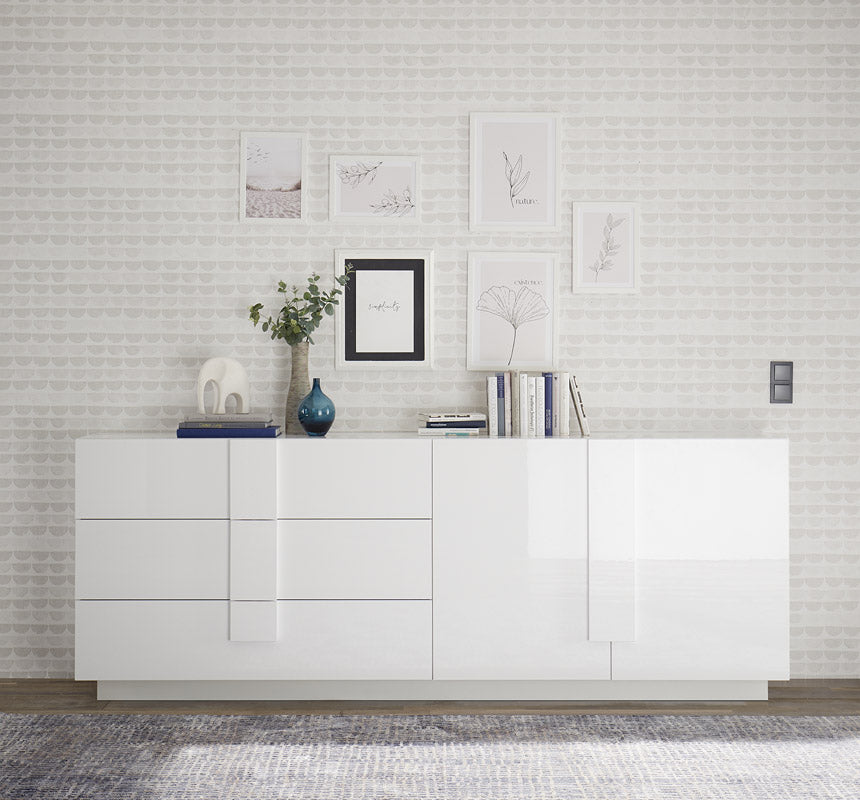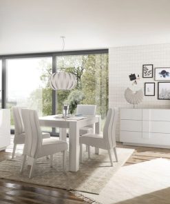 Straordinaria idea per arredare la tua zona giorno, con la nostra composizione living Sydney, formata da tavolo da cm 137 allungabile a cm 185, lunga madia da cm 241 e credenza da cm 182, dotate di ante e cassetti. Il legno bianco lucido regala un ambiente luminoso e il design lineare e minimale realizza uno stile ultra moderno.