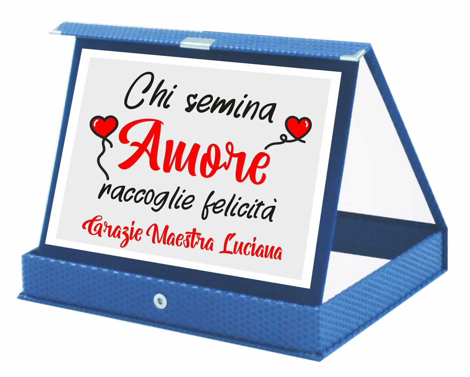 Targa stampata su alluminio, realizzata esternamente in tnt ed internamente in velluto. Dimensioni 16,5 x 11,5 cm.