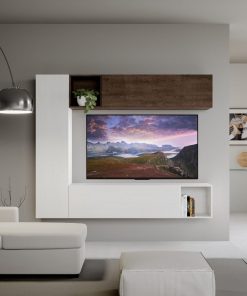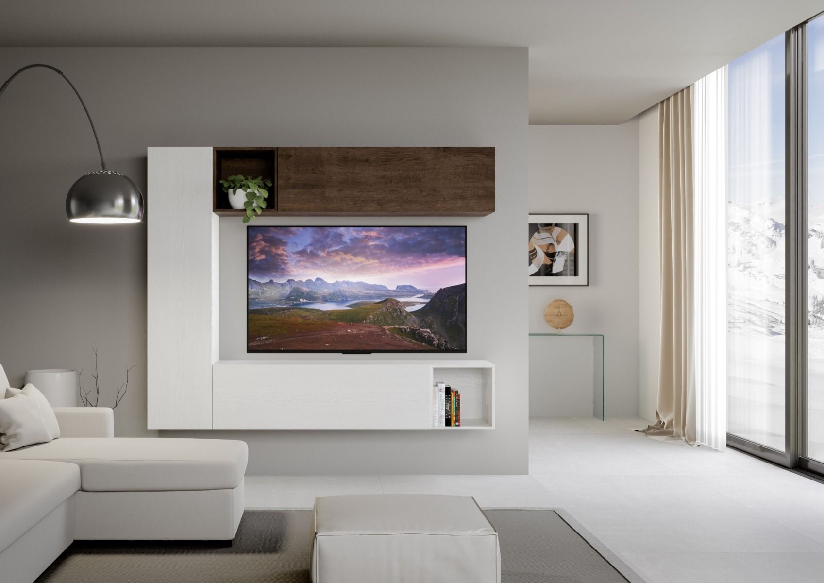 Parete sospesa per living formata da 6 pensili realizzati in legno bianco frassino e colore noce. La parete moderna Tarika è perfetta per chi desidera una composizione di dimensioni contenute