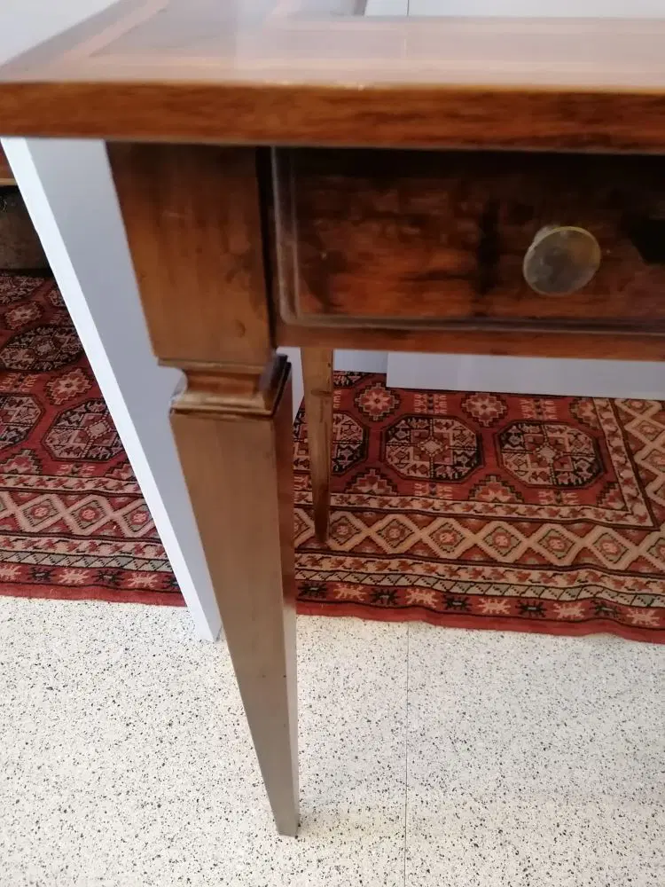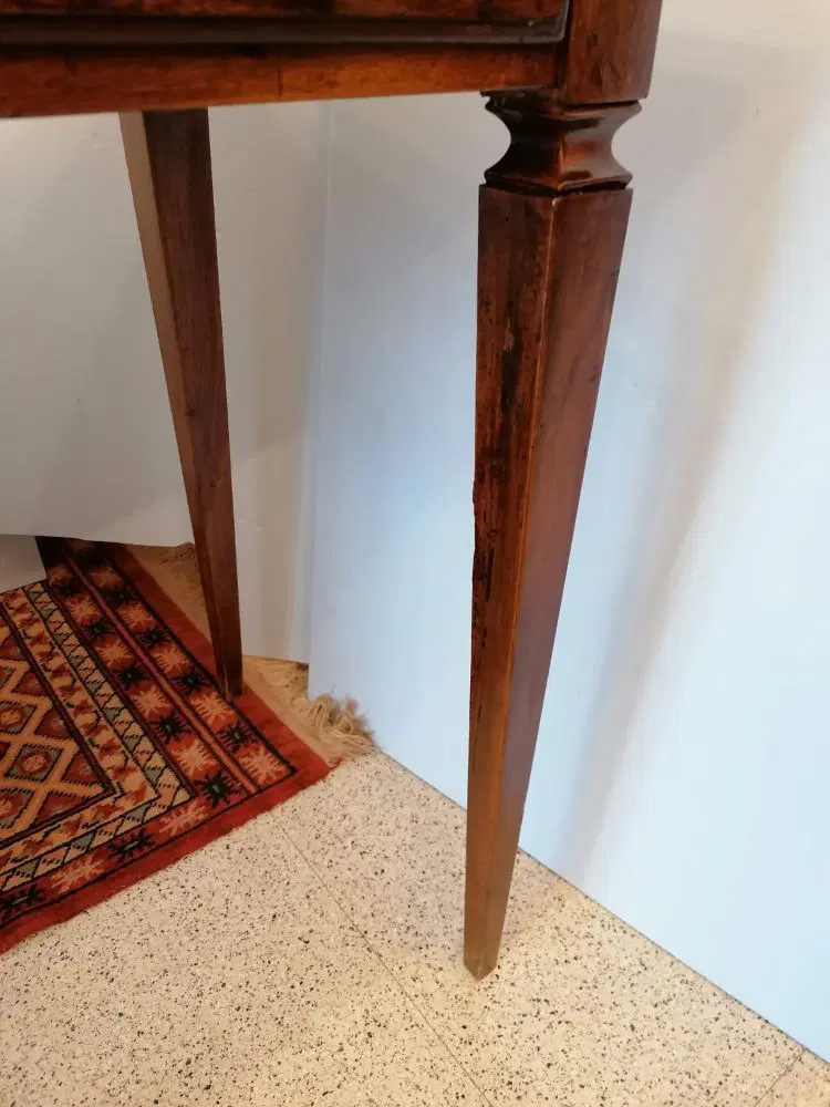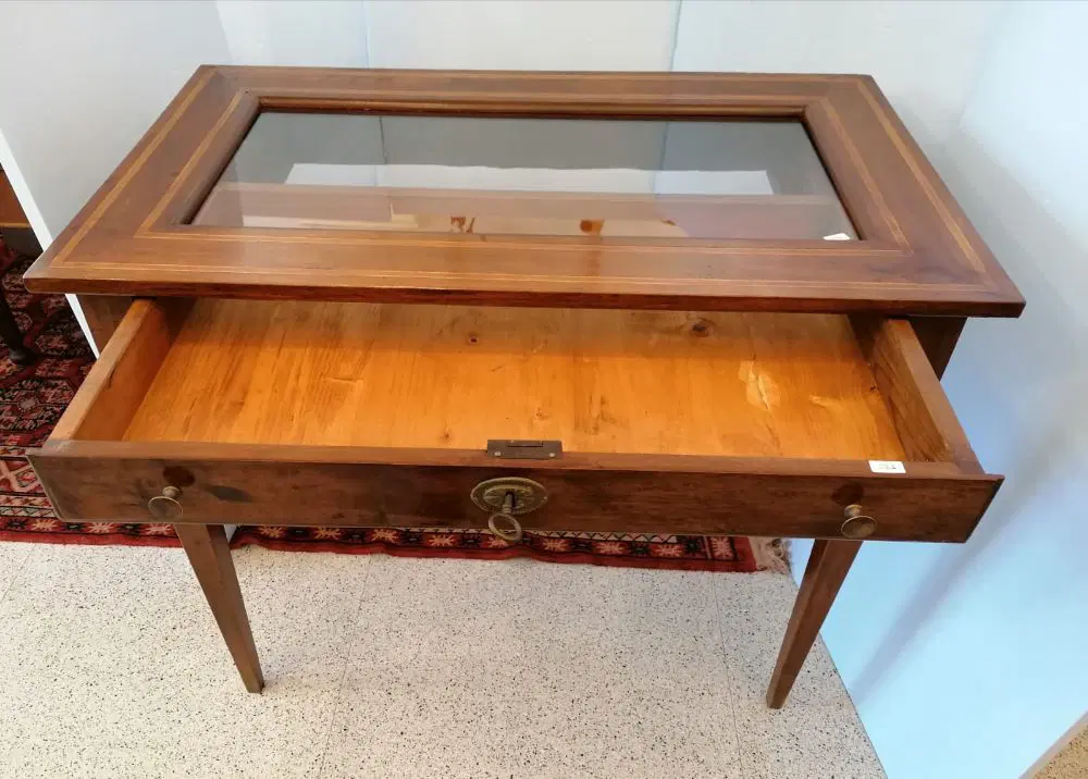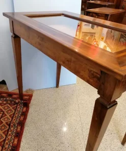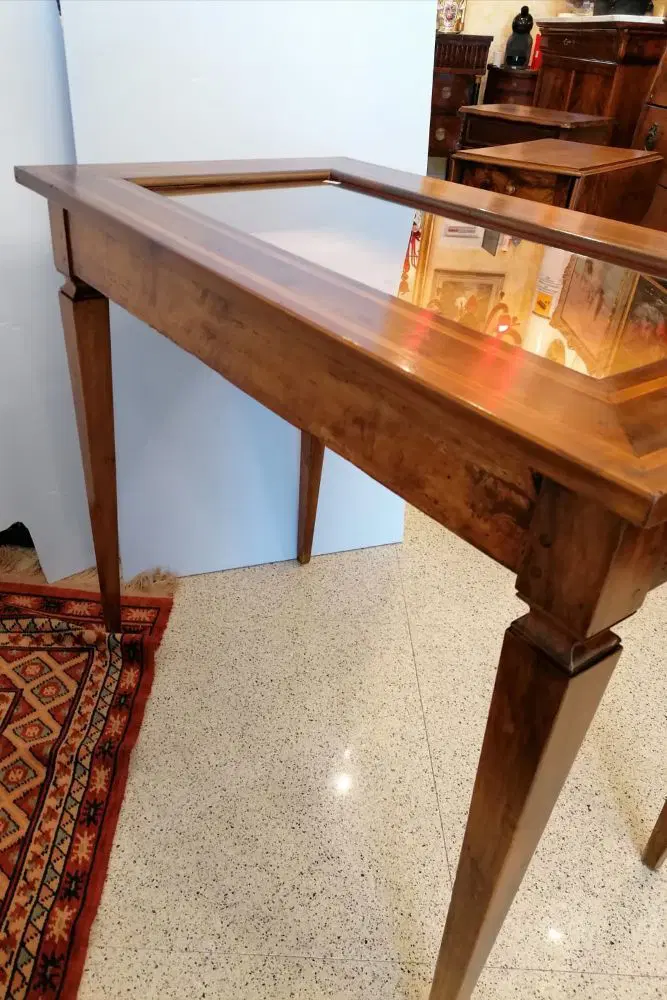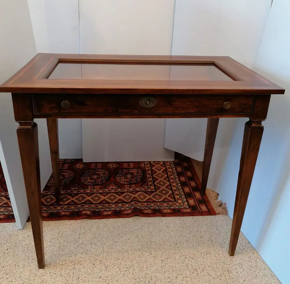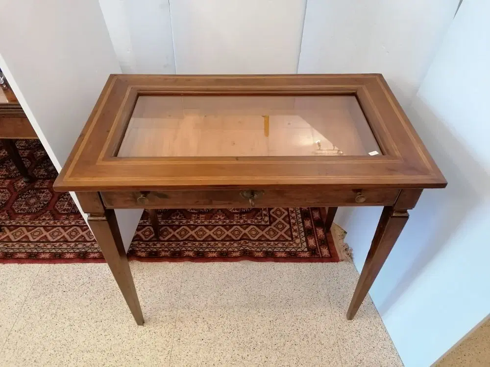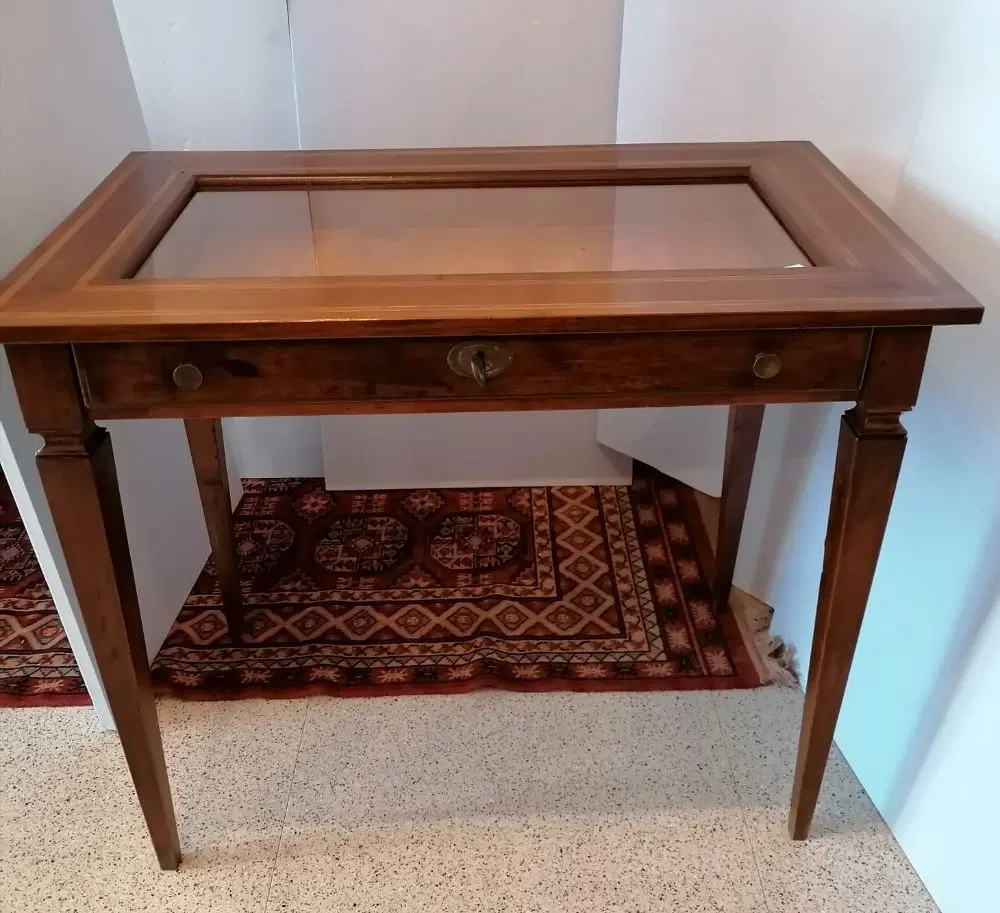 Elegante tavolino a bacheca in stile Luigi XVI, eseguito nel 1800, in noce con coperchio filettato. Dispone di un cassetto frontale estraibile. In ottime condizioni, molto ben tenuto non necessita di particolare restauro. Misure: lunghezza cm 90, profondità cm 53, altezza cm 77.