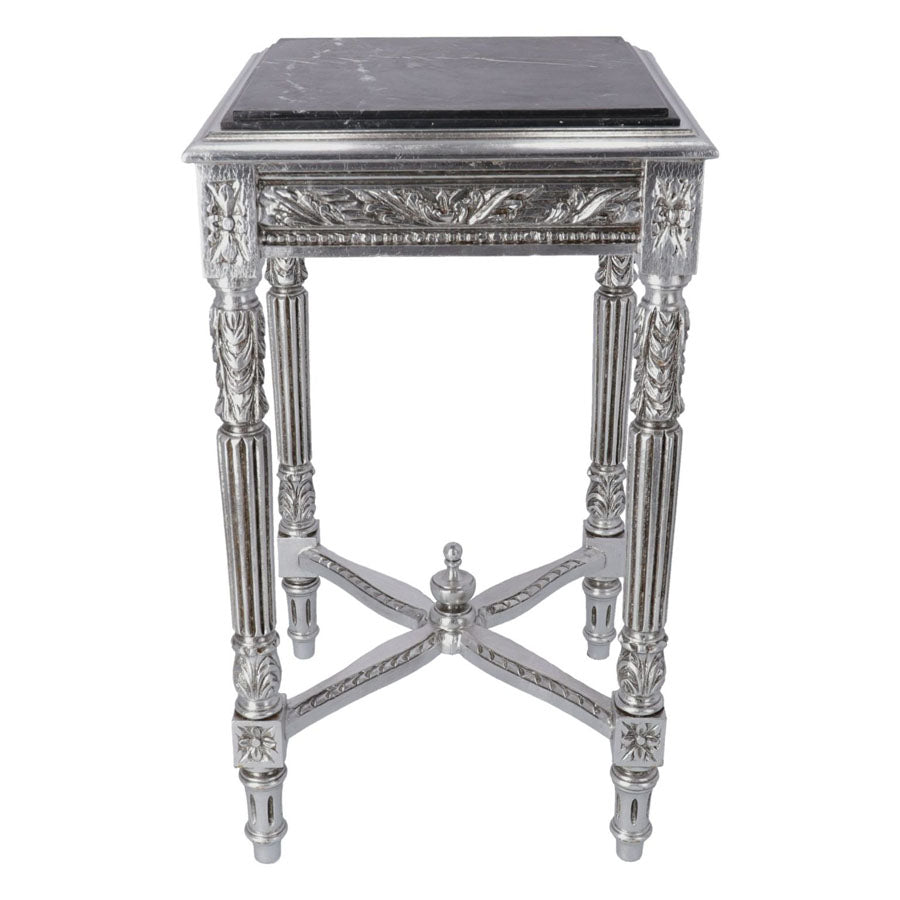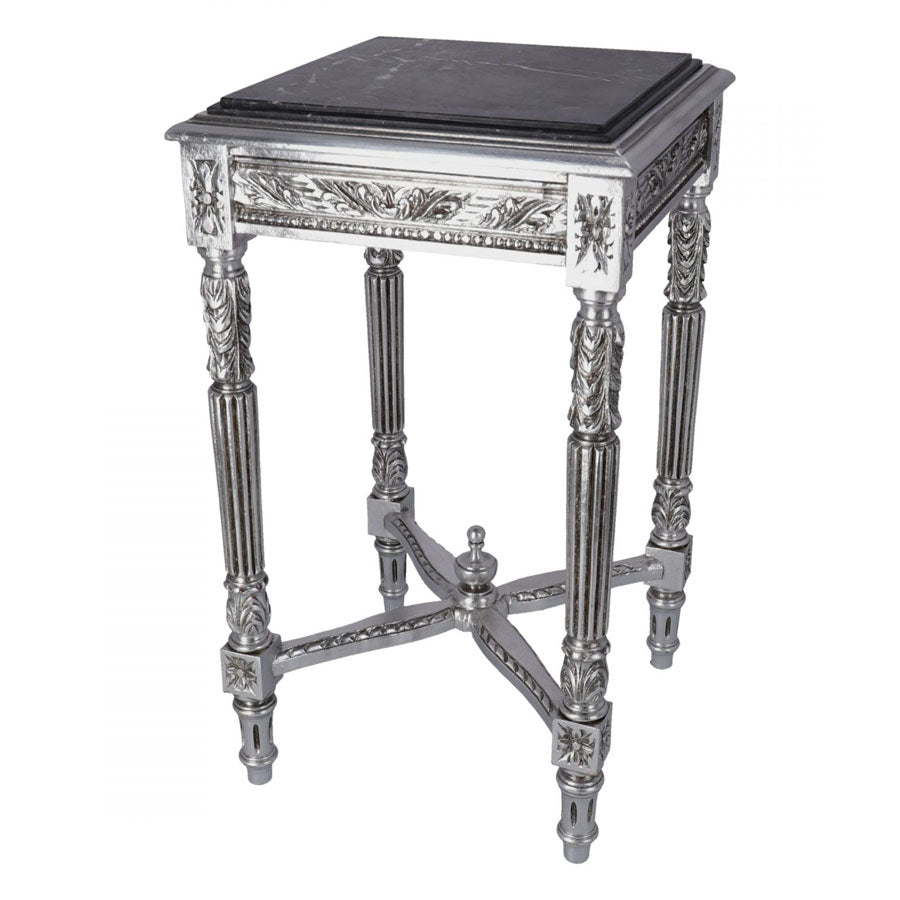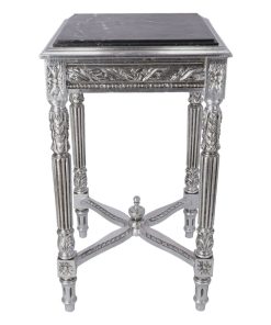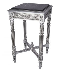 Tavolino alto da impiegare come alzatina per completare ed esaltare un arredo baroccheggiante dall’assoluta eleganza. Infatti i ricchi intagli tipici di questo stile realizzano un’affascinante struttura in legno. Non solo, ad accrescere la signorilità di questo complemento vi è il top in vero marmo colore nero che si abbina perfettamente al colore silver della base e crea un articolo unico e prezioso.
