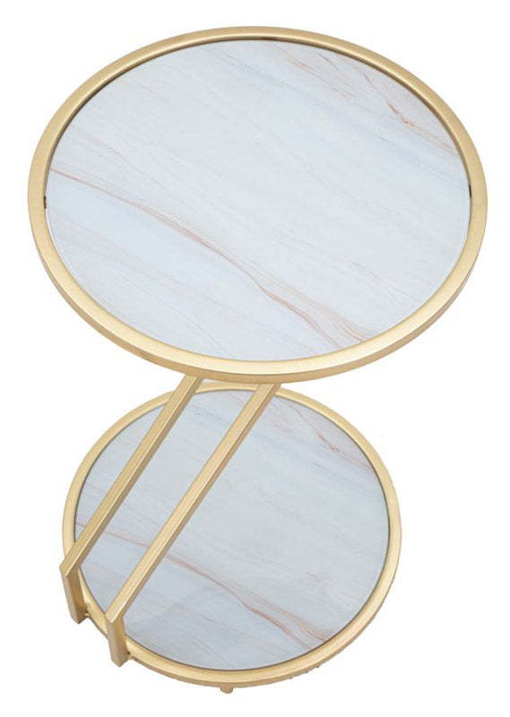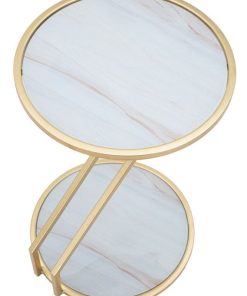 Tavolino tondo di design, utile per aggraziare il tuo salotto e renderlo più glamour. Infatti, il tavolinetto è realizzato in metallo colore oro con due fantastici piani realizzati in vetro dalla sfumatura che riproduce un suggestivo effetto marmo.