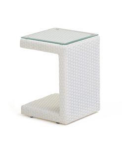 Tavolino basso da giardino realizzato in robusto polyrattan di colore bianco, per garantire resistenza e lunga durata. Il tavolino si presenta con un look al quanto moderno, anche per via della sua particolare forma. Provvisto di un piano di appoggio in vetro, questo tavolino si rende molto utile per posizionare oggetti o per appoggiare bicchieri e vassoi durante i momenti di relax.
