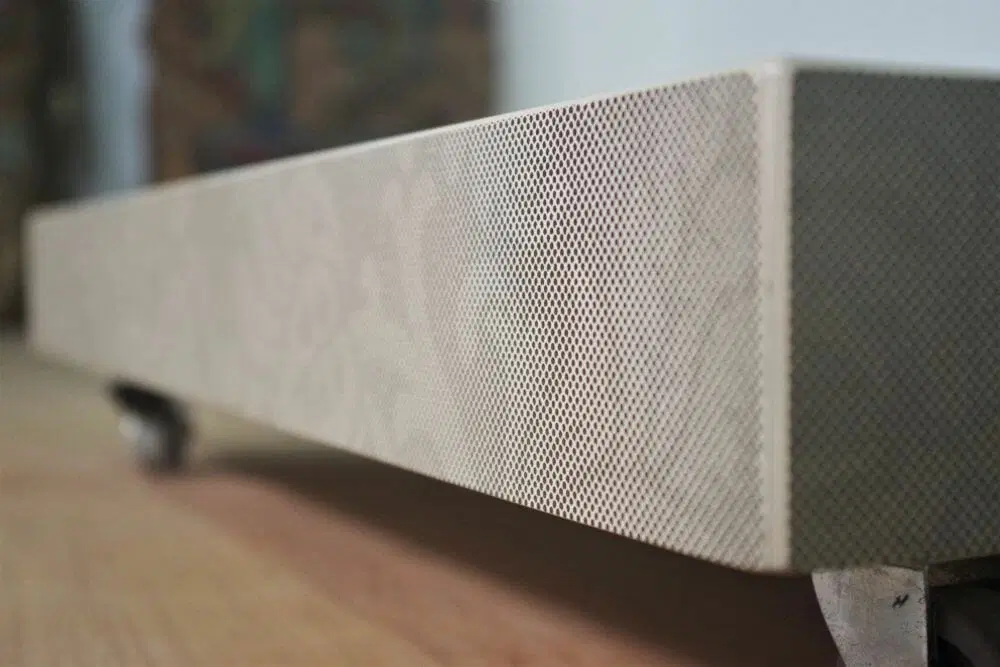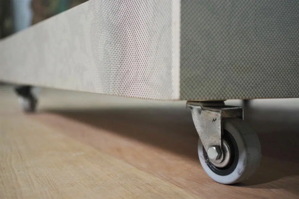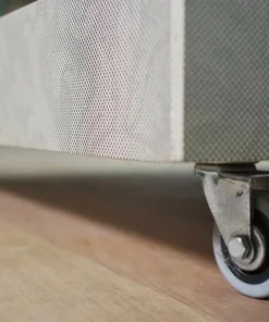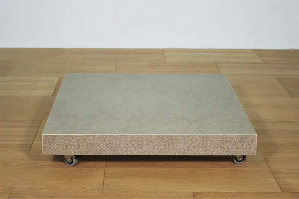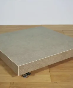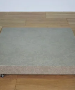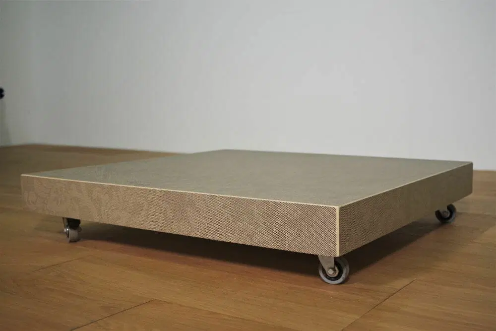 Tavolino basso in vetro ceramico di design artigianale con rotelle e freno anni 2000.