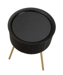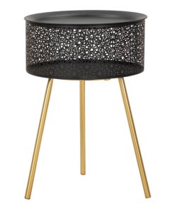 Grazioso tavolino rotondo con pratico vano contenitore, sobrio ma piacevole grazie a piccoli dettagli che lo contraddistinguono come la lavorazione traforata che decora il bordo perimetrale del contenitore. Composto da 3 gambe in metallo dorato, questo piccolo tavolinetto è accompagnato da vassoio. Inoltre, potrai scegliere tra due misure.