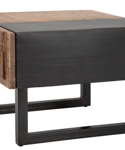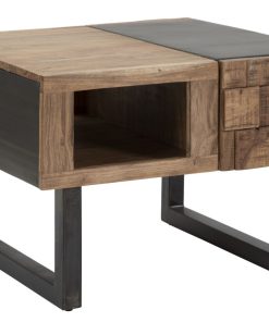 Tavolino basso da caffè prodotto in ottimo legno di acacia con parti in metallo. Questo utile complemento rientra in una bellissima linea di mobili dal chiaro stile industrial, caratterizzato dalla lavorazione a scacchi e in rilievo dei frontali dei cassetti.