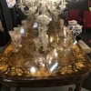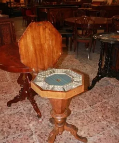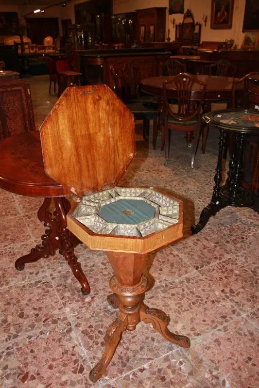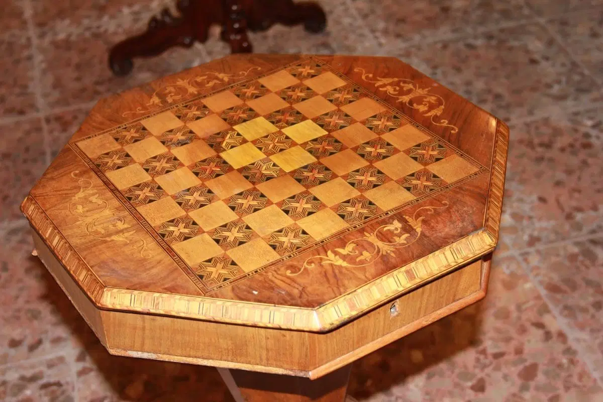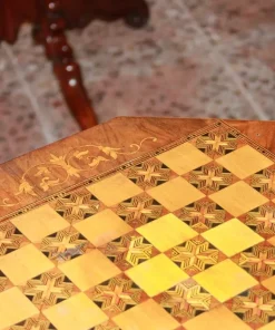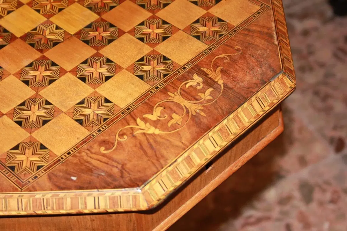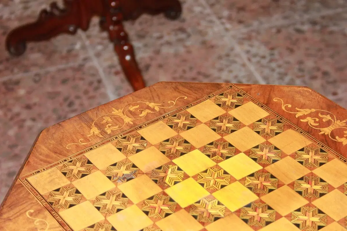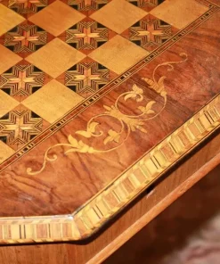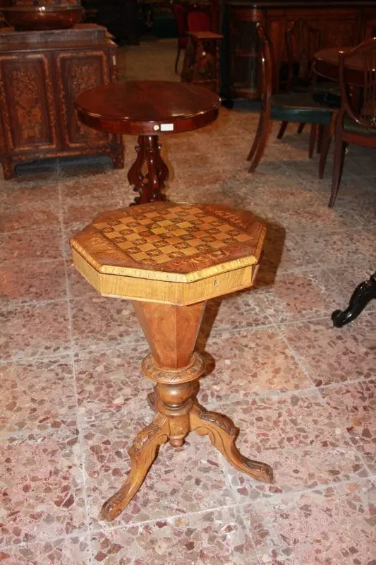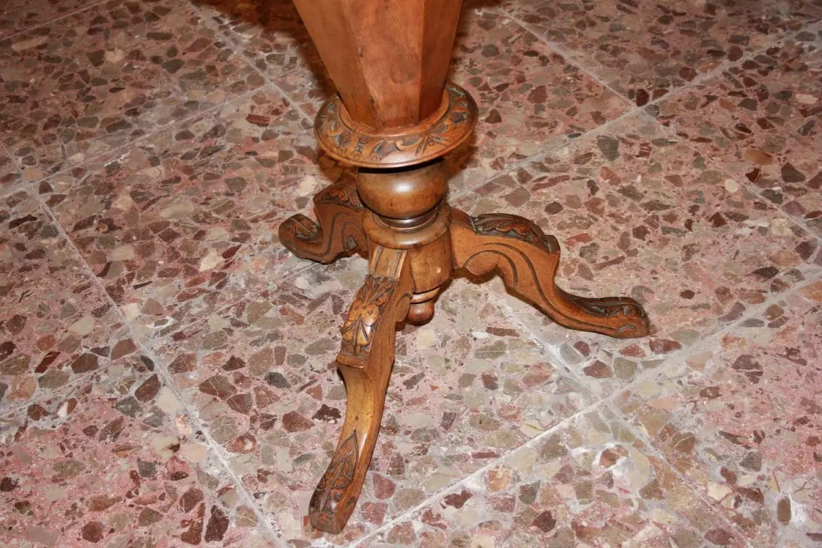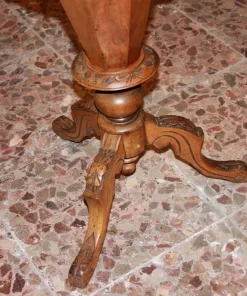 Tavolino da lavoro inglese della seconda metà del 1800 stile Vittoriano in legno di noce. Presenta piano di forma ottagonale riccamente intarsiato a motivo floreale con scacchiera, corpo ad imbuto che si dirama in tre piedini intagliati.