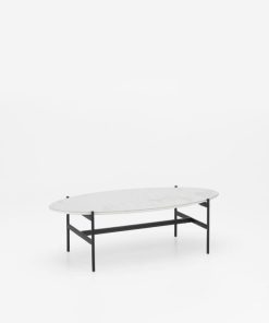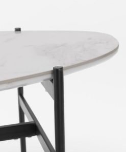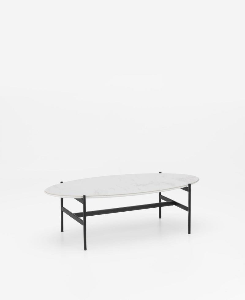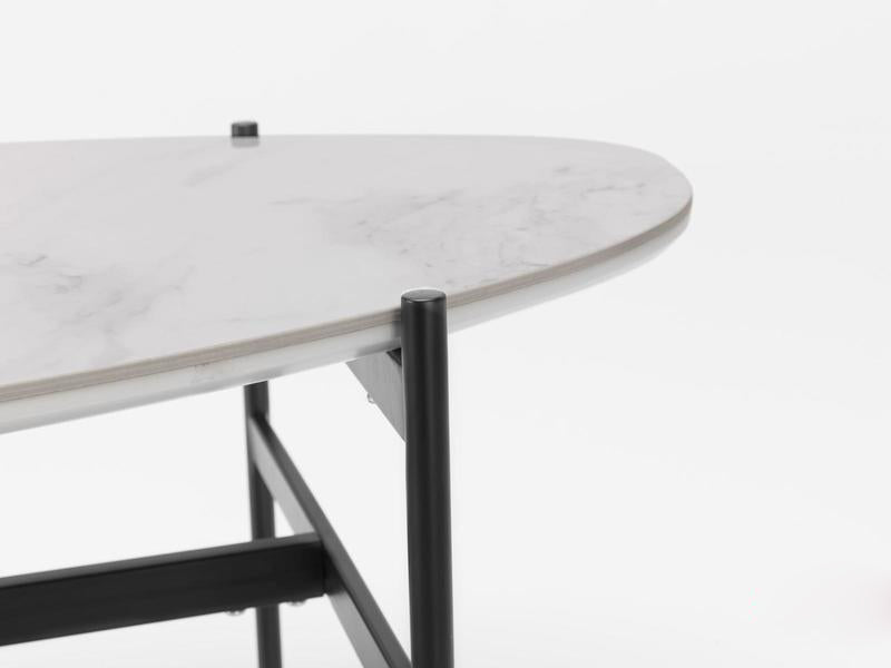 Tavolino ovale basso da salotto, dallo stile singolare con struttura in metallo verniciato nero e piano in legno e ceramica bianca. Da correlare con il tavolino rotondo dello stesso design.