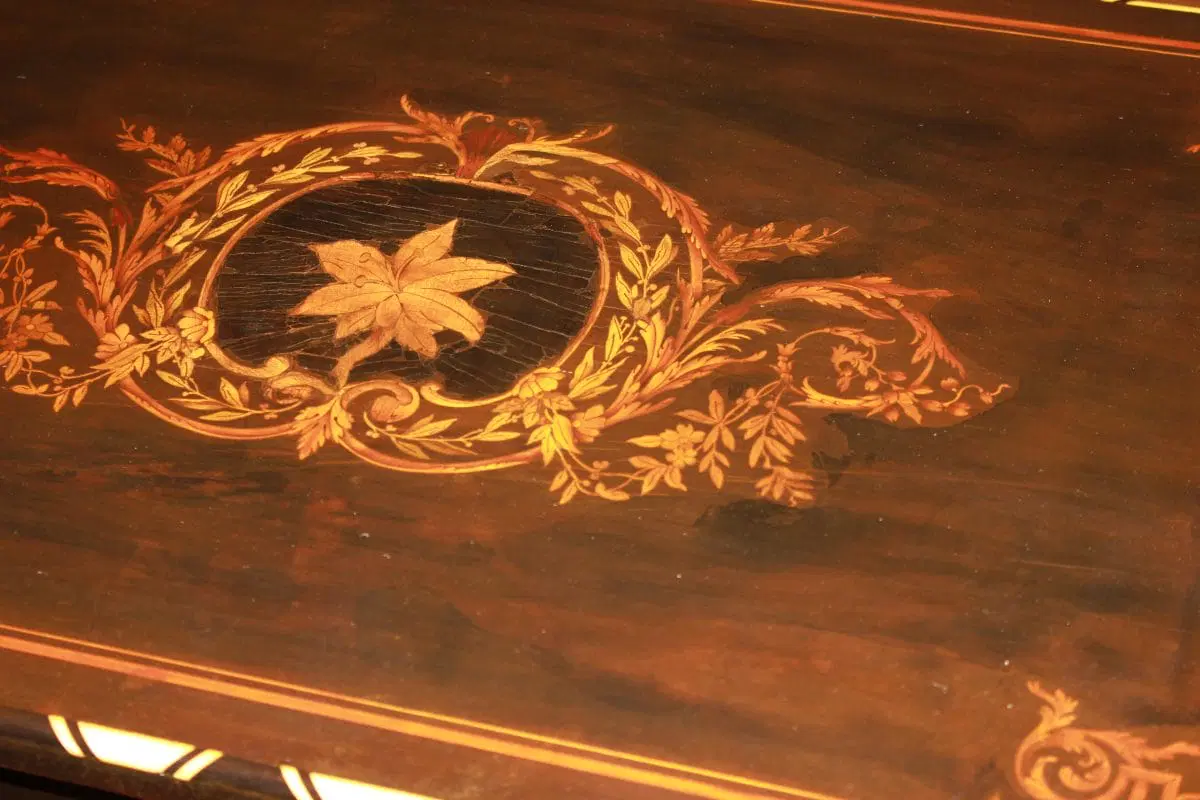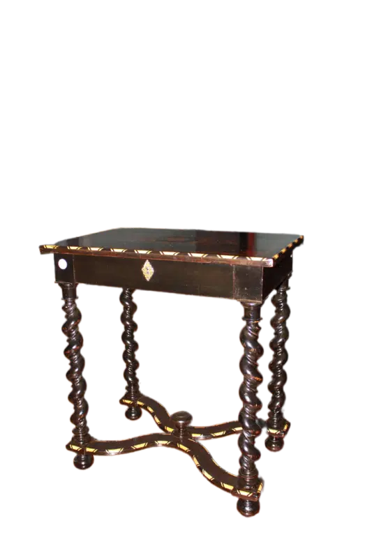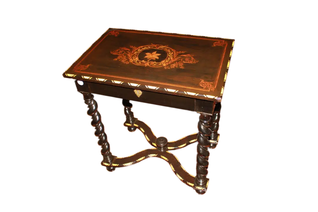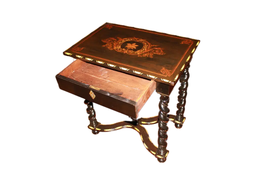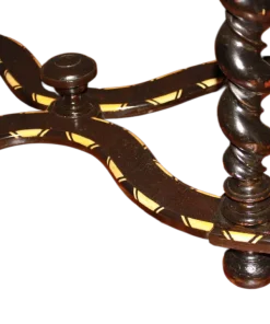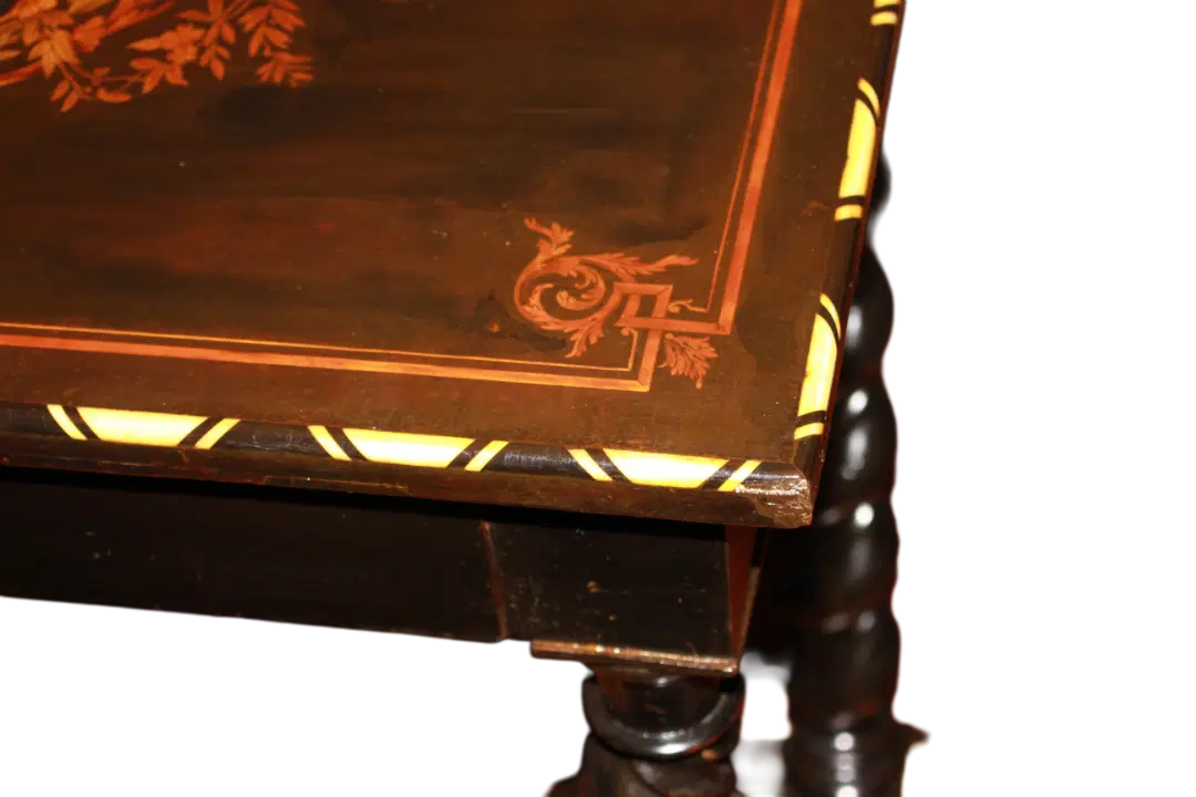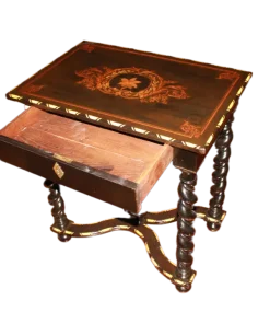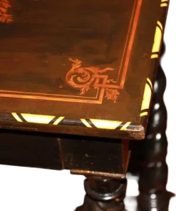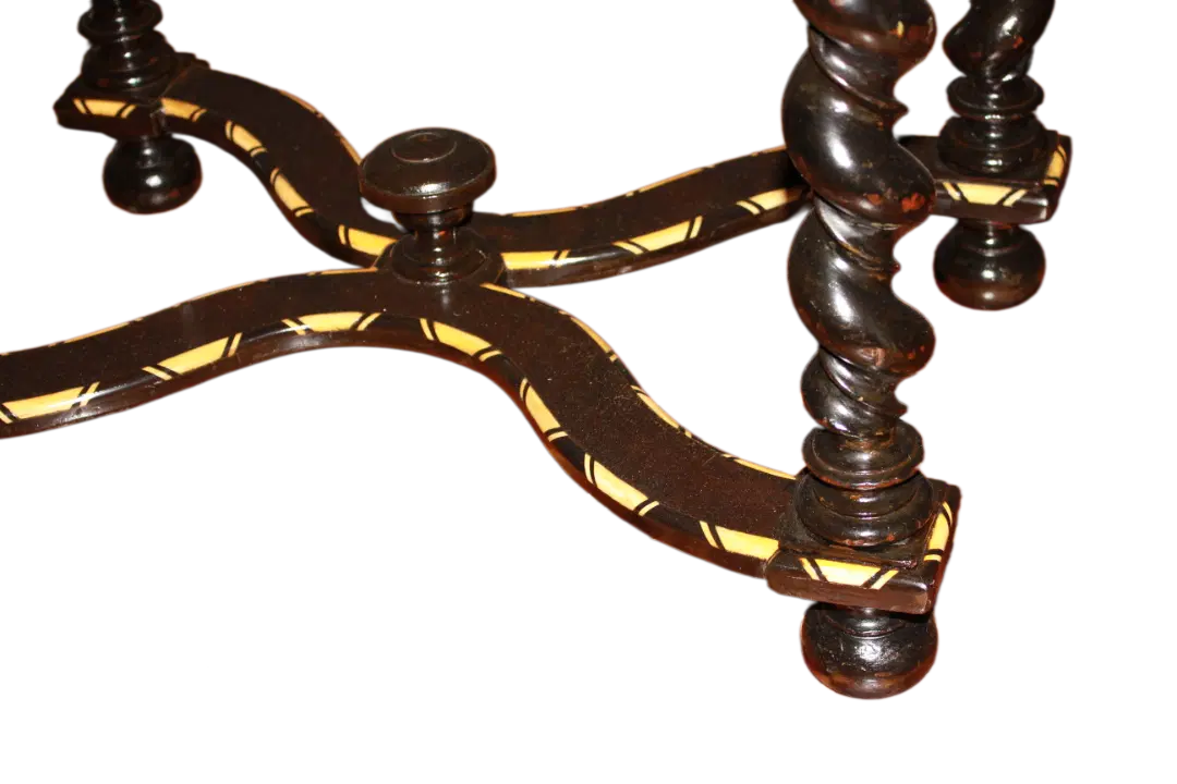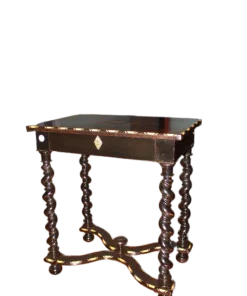 Tavolino olandese di inizio 1800 in legno di ebano con piano riccamente intarsiato. Presenta cassetto sottopiano, piano riccamente intarsiato e 4 gambe a torchon riunite da crociera. Intarsi in Avorio.
