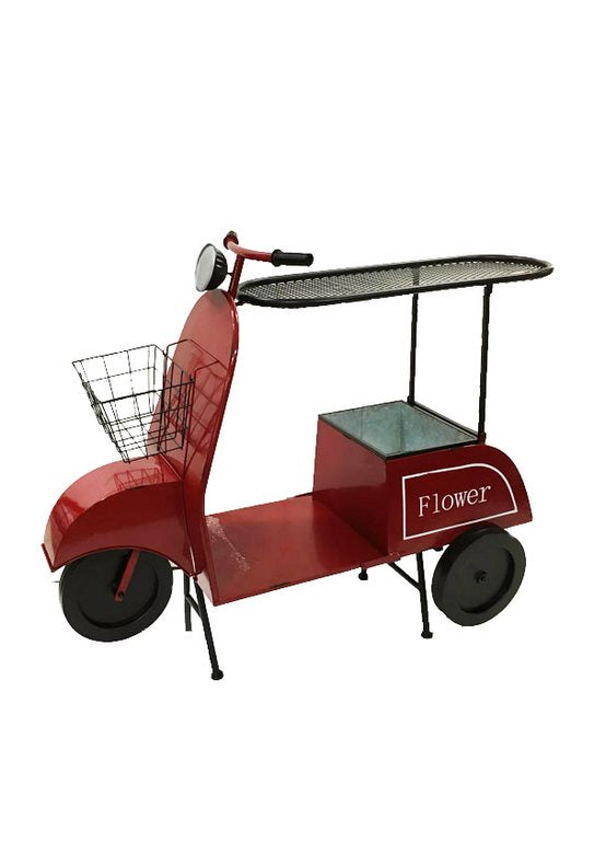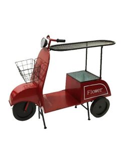 Tavolino modello vespa realizzato in metallo dal colore rosso, con piano per appoggiare bicchieri e vano portabottiglie o porta fiori. Un mobile unico per arredare con fantasia qualsiasi ambiente.