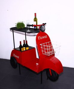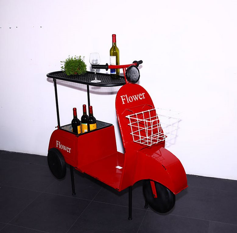 Estremamente fantasioso questo tavolino portavivande e portabottiglie, eccellente per chi progetta un salotto originale con elementi unici in perfetto stile industrial vintage. Infatti, questo tavolino in metallo ricalca una vecchia vespa, adattata con piano d’appoggio e vano che potrai utilizzare per accogliere bottiglie, ma anche da utilizzare come porta piante e decorare l’ambiente.