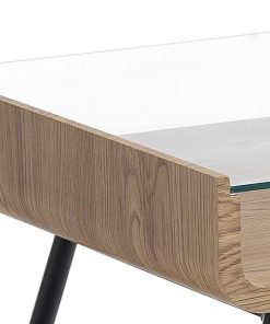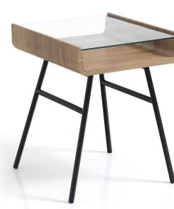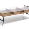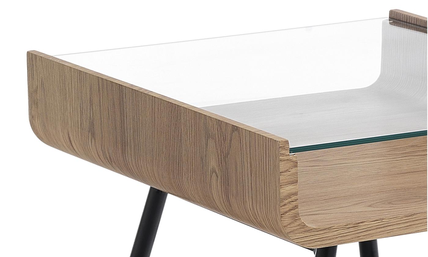 Tavolino da caffè per salotto formato da struttura in legno finitura rovere e piano in vetro trasparente, con gambe oblique in metallo verniciato nero.