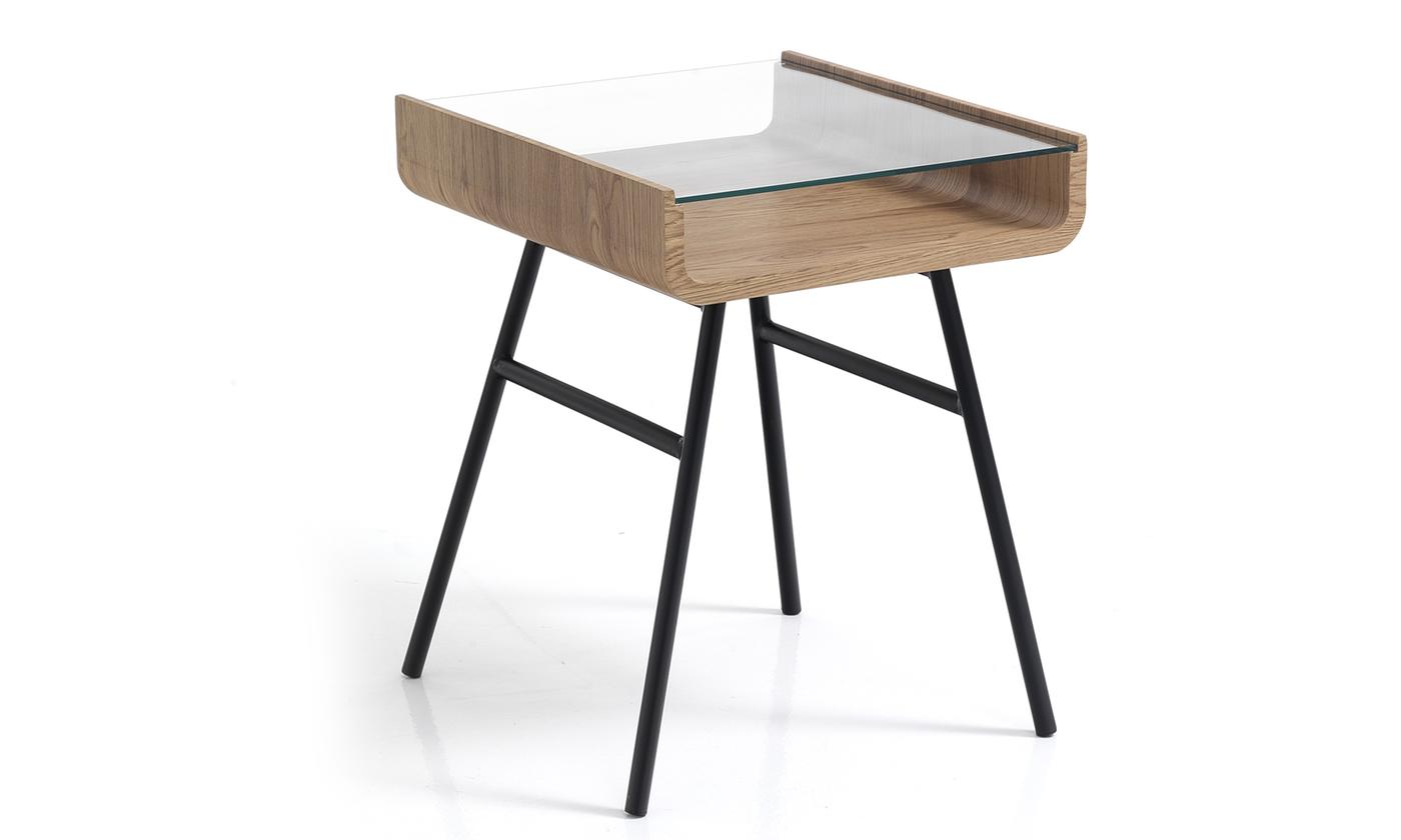 Tavolino basso di forma quadrata da inserire davanti o affianco al divano, caratterizzato da struttura in legno curvato e top in vetro trasparente, dotato di gambe in metallo verniciato nero. Il tavolino si presta anche come comodino da accoppiare a un letto moderno.