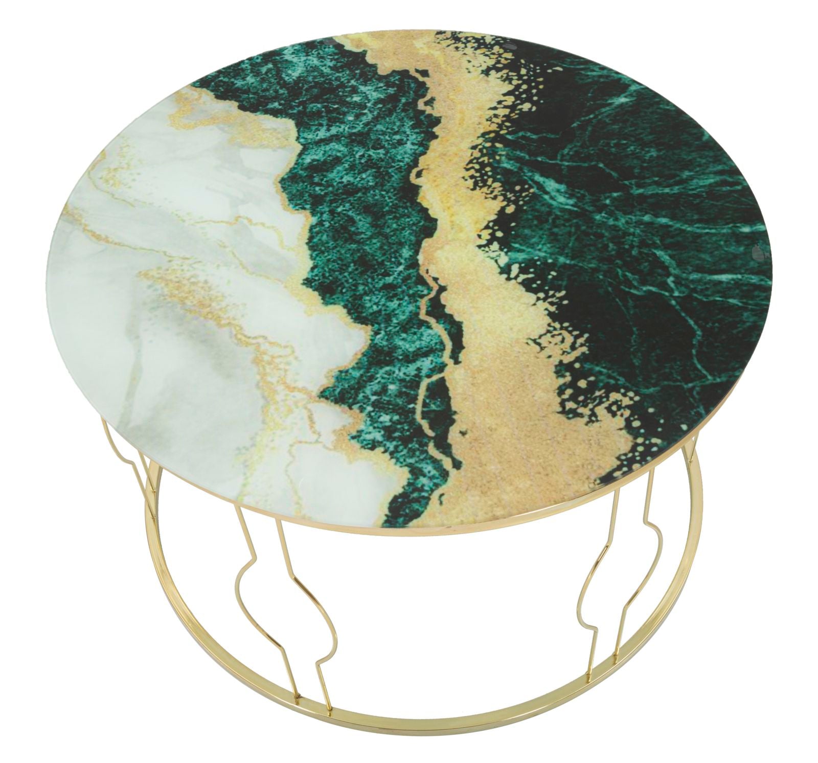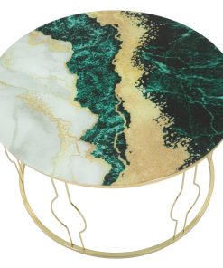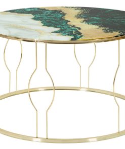 Tavolino da caffè tondo ampio 75 cm, perfetto per accompagnare il divano e le poltrone e realizzare un salotto elegante. Questo particolare tavolino moderno sfoggia un piano in vetro con sfumature cromatiche accese ma armoniche, con predominanza del verde abbinato all’oro. La base tonda è realizzata in metallo dorato, decorata con linee curve che regalano un design raffinato.
