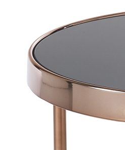 Interessante tavolo tondo basso da sistemare nel salotto o da utilizzare, perché no, come un insolito comodino da camera. La struttura in metallo presenta una caratteristica finitura rose gold con piano e ripiano inferiore realizzati in vetro temprato nero coprente.