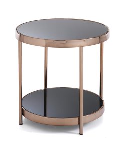 Tavolino basso rotondo con due piani realizzati in vetro temprato nero coprente, inseriti in una semplice struttura in metallo rose gold.