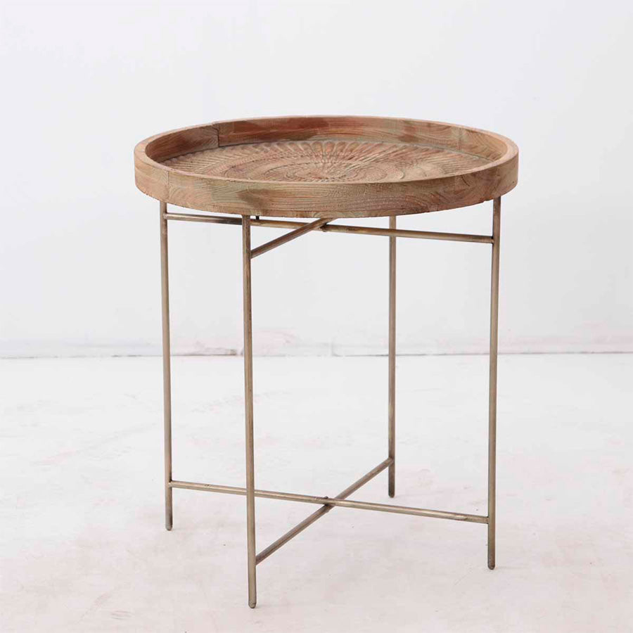 Tavolino con piano in legno naturale, dalla forma tonda, base in metallo champagne. Perfetto da collocare in salotto, darà il giusto look industrial alla vostra stanza.