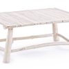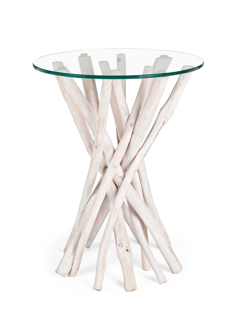 Tavolino basso da salotto tondo, un modello assolutamente nuovo con base composta da rami di teak sbiancato e piano in vetro.