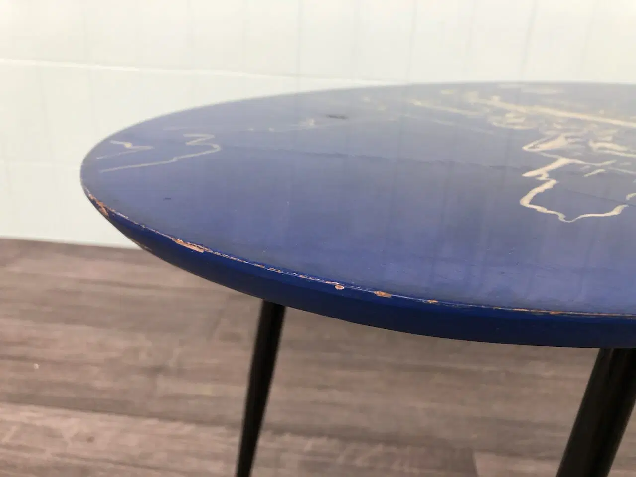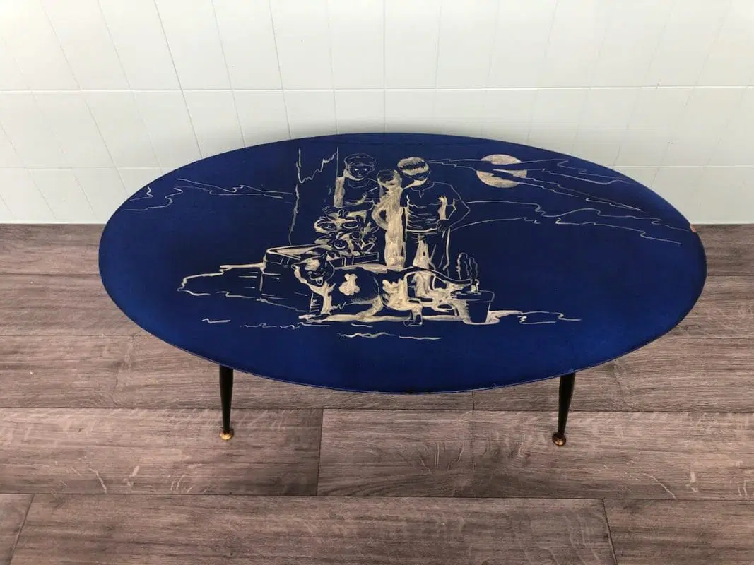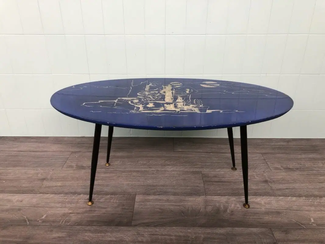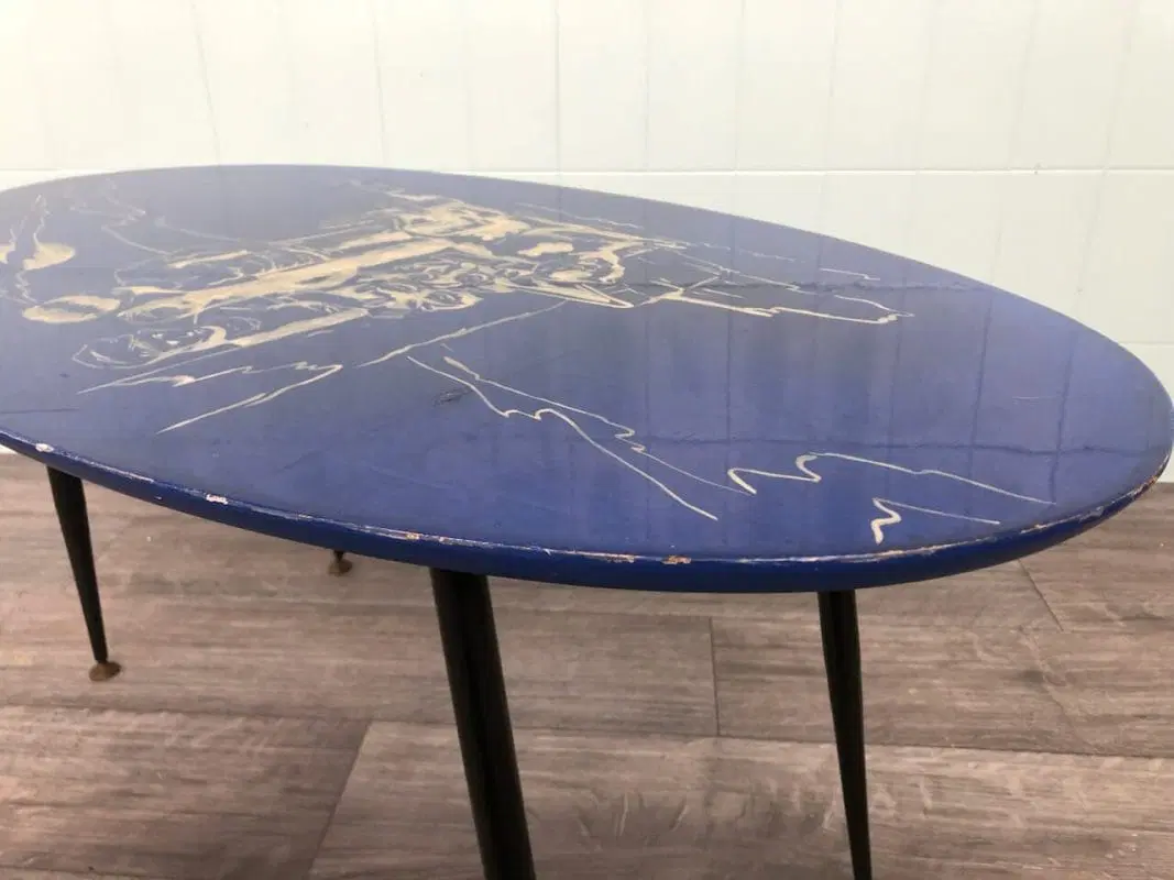 Gambe In metallo e piano in legno laccato in cui è stato fatto un dipinto a mano.