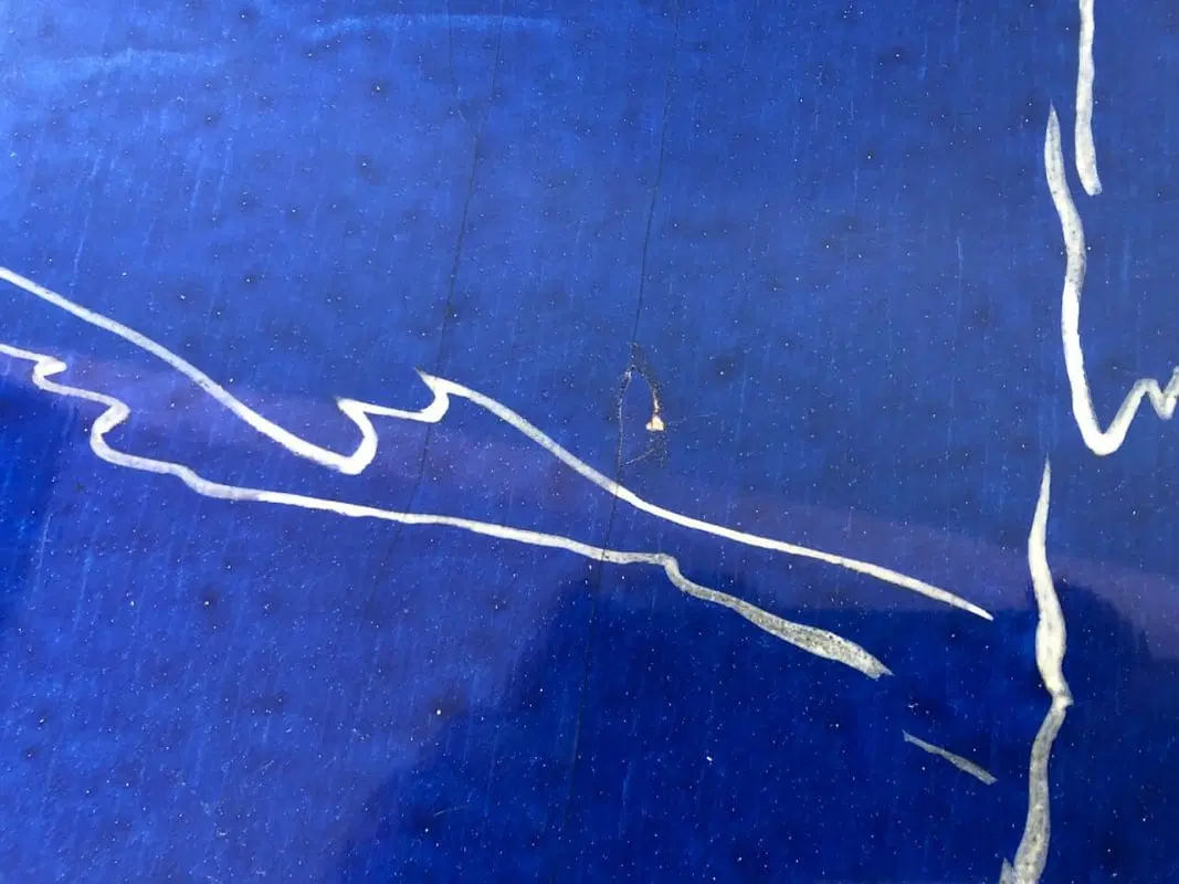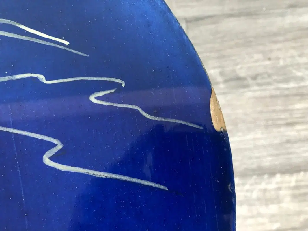Come si può vedere ha una sbeccatura sul piano, qualche piccolo graffio è una macchia nera. Inoltre presenta dei segni sui bordi