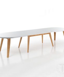 Ottimo tavolo allungabile in legno, il modello giusto per chi cerca un tavolo che si estende fino a 300 cm e che abbia il piano di forma ovale. Ciò che emerge subito di questo tavolo da pranzo è la massiccia struttura realizzata in legno massello colore rovere, progettata con un sistema di estensione che sdoppia le gambe ottenendo un supporto centrale solido e stabile. Il piano del tavolo è realizzato in legno colore bianco che contrasta con le gambe e crea un piacevole bicolore.