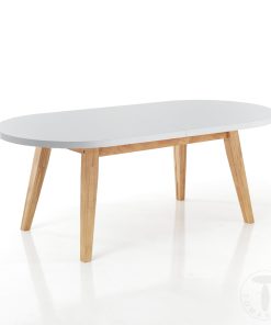 Ottimo tavolo allungabile in legno, il modello giusto per chi cerca un tavolo che si estende fino a 300 cm e che abbia il piano di forma ovale. Ciò che emerge subito di questo tavolo da pranzo è la massiccia struttura realizzata in legno massello colore rovere, progettata con un sistema di estensione che sdoppia le gambe ottenendo un supporto centrale solido e stabile. Il piano del tavolo è realizzato in legno colore bianco che contrasta con le gambe e crea un piacevole bicolore.