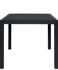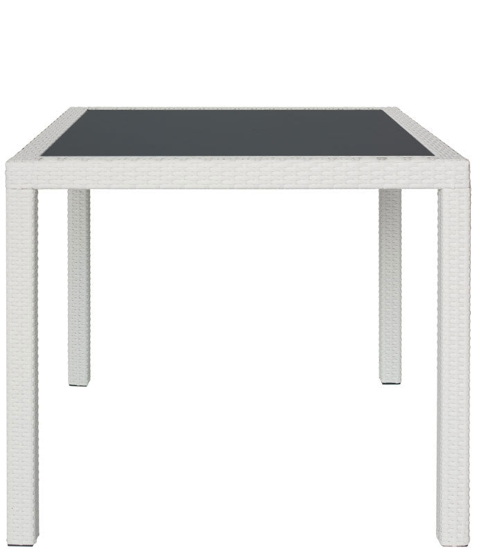 Tavolo quadrato contract con rivestimento in polyrattan e piano in vetro nero, una soluzione pensata per l’arredo contract o domestico.