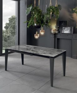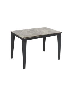 Tavolo allungabile moderno dalle dimensioni di cm 120 estensibile a cm 170 tramite allunga da cm 50. Elegante grazie al vistoso piano realizzato con uno strato di ceramica e uno in vetro finitura marmo.