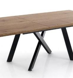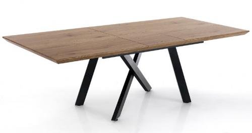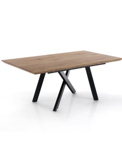 Tavolo allungabile moderno rettangolare con piano in legno finitura rovere e gambe ad X in metallo verniciato nero.