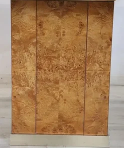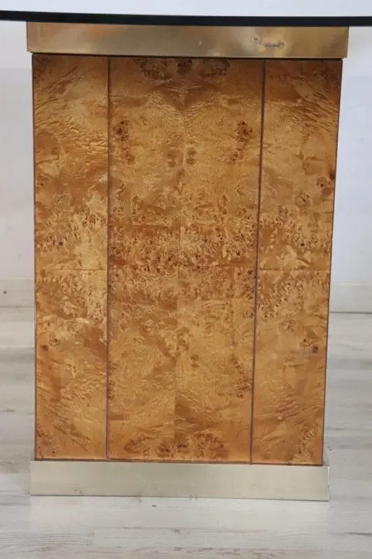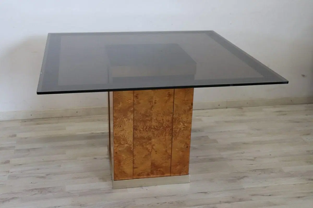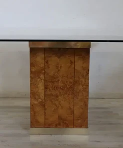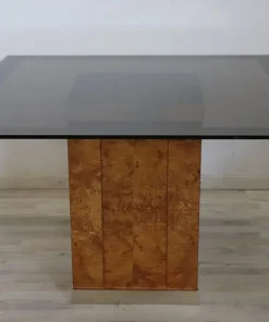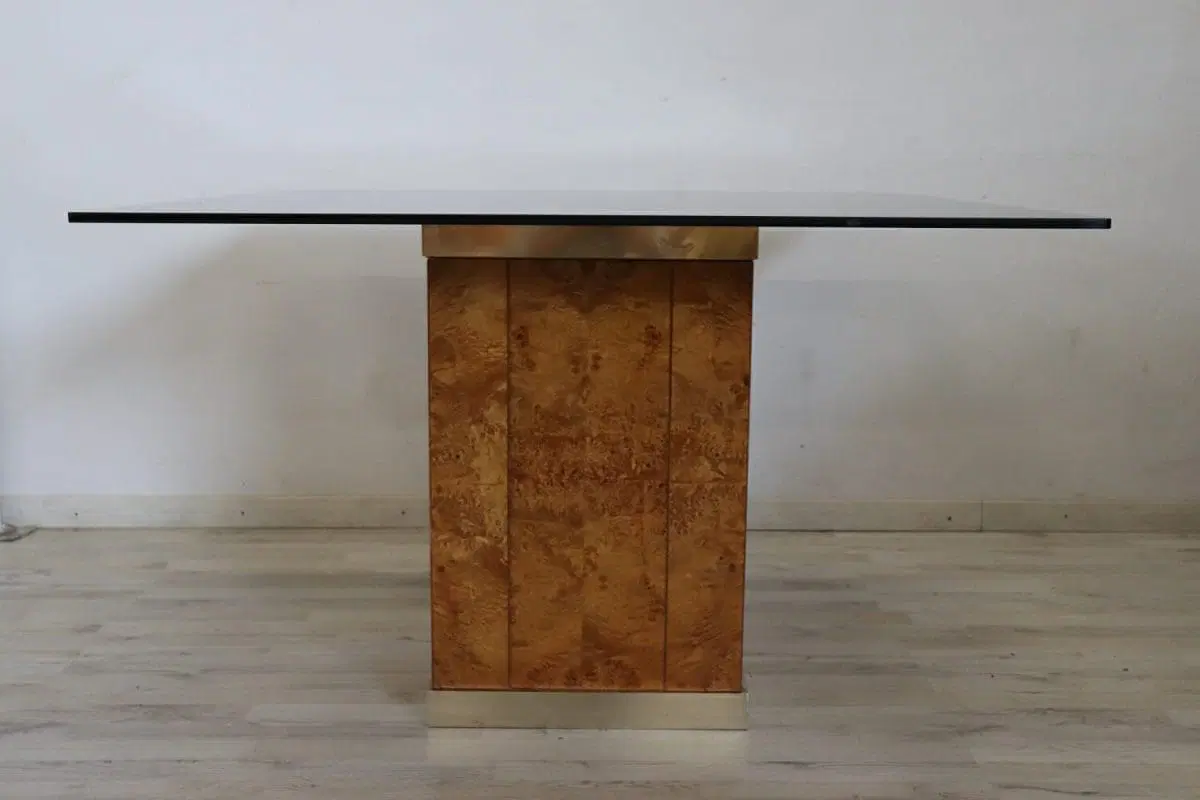 Raffinato tavolo da pranzo quadrato design francese degli anni ’80 di Jean Claude Mahey per Roche Bobois. Questo fantastico tavolo ha una base in pregiata radica di noce con dettagli in metallo dorato e un piano in vetro fumé scuro. Ci sono alcuni segni di usura sul piano e un piccolo segno nel metallo dorato sotto il piano. Vi chiediamo di guardare attentamente tutte le foto in dettaglio. Tavolo perfetto per un ambiente moderno. Questo pezzo è attribuito per caratteristiche documentate nella storia del design al designer/produttore riportato sopra. Non ha alcun marchio di attribuzione impresso. prezzo trattabile vi invitiamo ad inviarci le vostre proposte di acquisto le valuteremo con piacere.