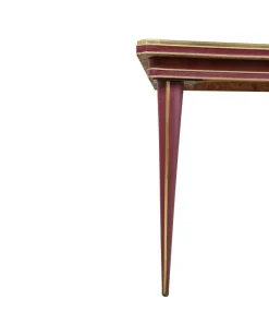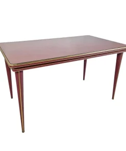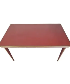 Tavolo da pranzo di Umberto Mascagni (Bologna, anni ’50). La struttura del corpo principale e le quattro gambe sono in legno massello, rivestite in pelle rossa con profili in ottone. Il top, anch’esso in pelle rossa, è protetto da una lastra in vetro trasparente. Ottimo lo stato di conservazione.