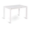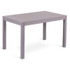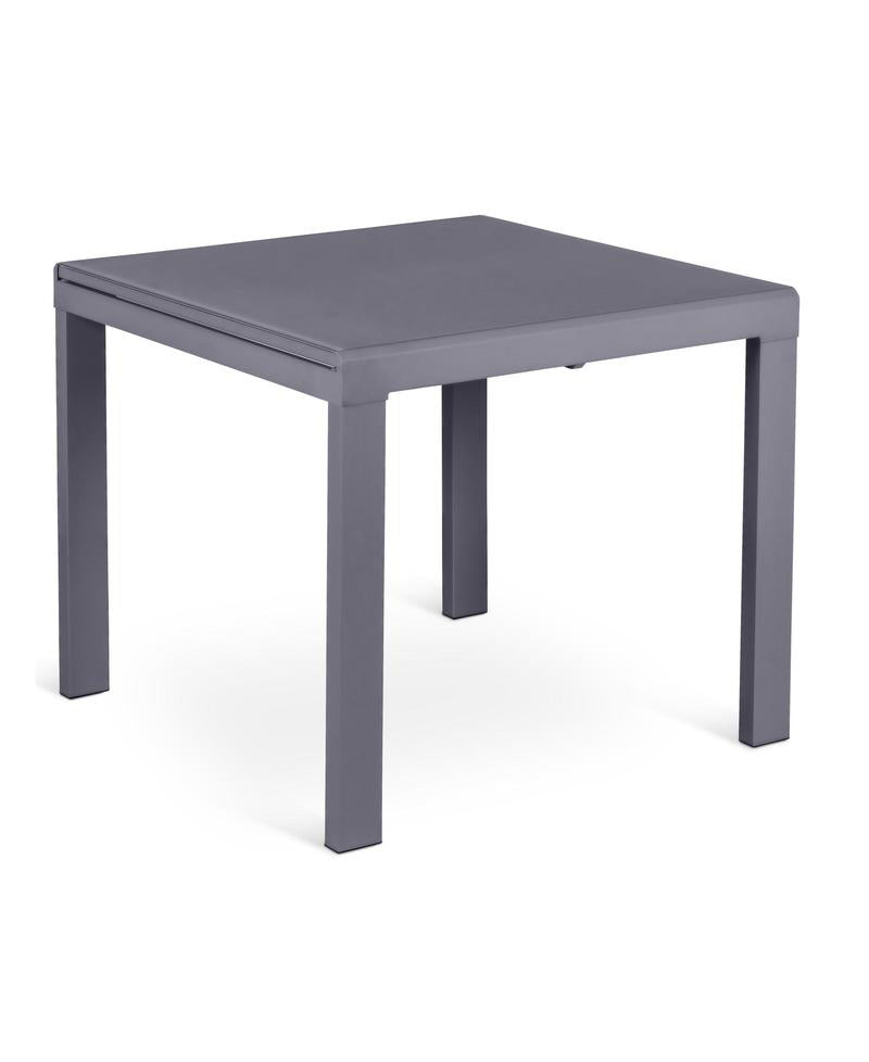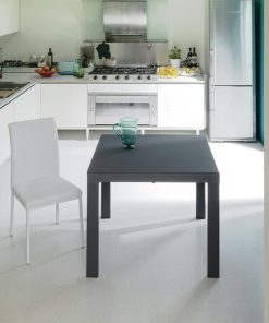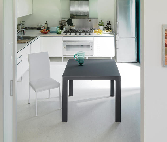 Tavolo da pranzo allungabile moderno quadrato, dalle dimensioni standard, realizzato in metallo e piano in vetro acidato grigio.