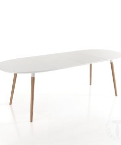 Elegante tavolo da soggiorno utile per pranzi e cene in famiglia o in compagnia di amici o parenti. La struttura è sorretta da 4 solide gambe in legno massello con una finitura rovere che sprigiona luminosità e modernità, ed sul piano di appoggio viene applicata una verniciatura di colore bianco opaco che esalta la classe di un elemento di stile moderno che si adatta in ogni ambiente e con ogni genere di arredamento.