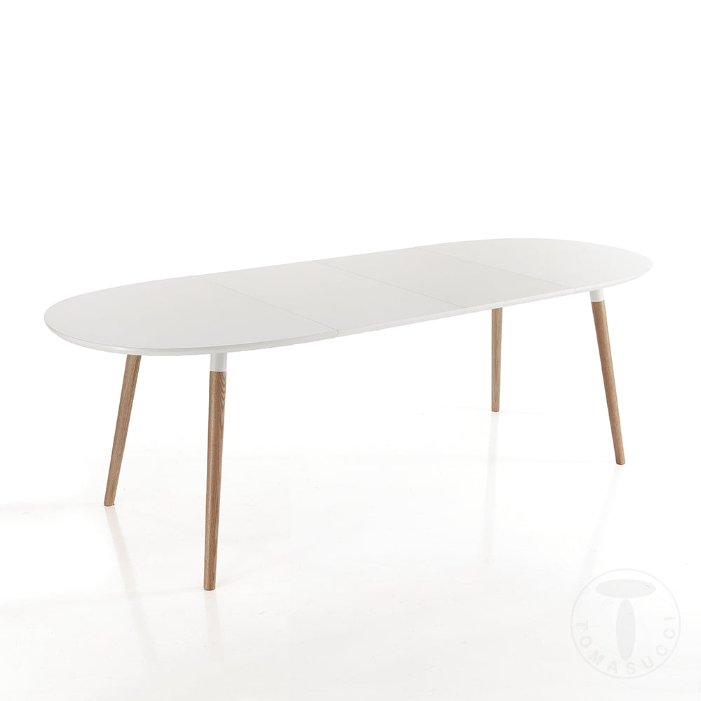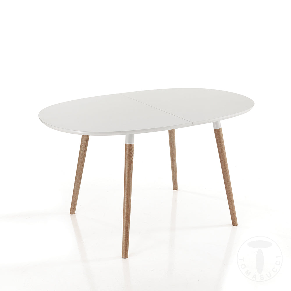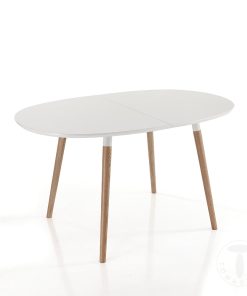 Tavolo da cucinasoggiorno ideale per ambienti moderni composto interamente in legno e fornito di un piano di appoggio di colore bianco opaco e delle gambe in legno massello dotate di una particolare e affascinante finitura rovere. L’accostamento di un bianco che cattura la luce e sprigiona una grande luminosità con una finitura rovere chiaro che mette in risalto le forme del tavolo e lo rende elegante e moderno, crea un gioco di colori molto accattivante capace di creare elementi unici e inimitabili.