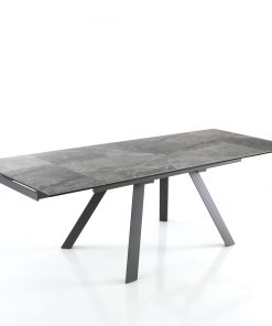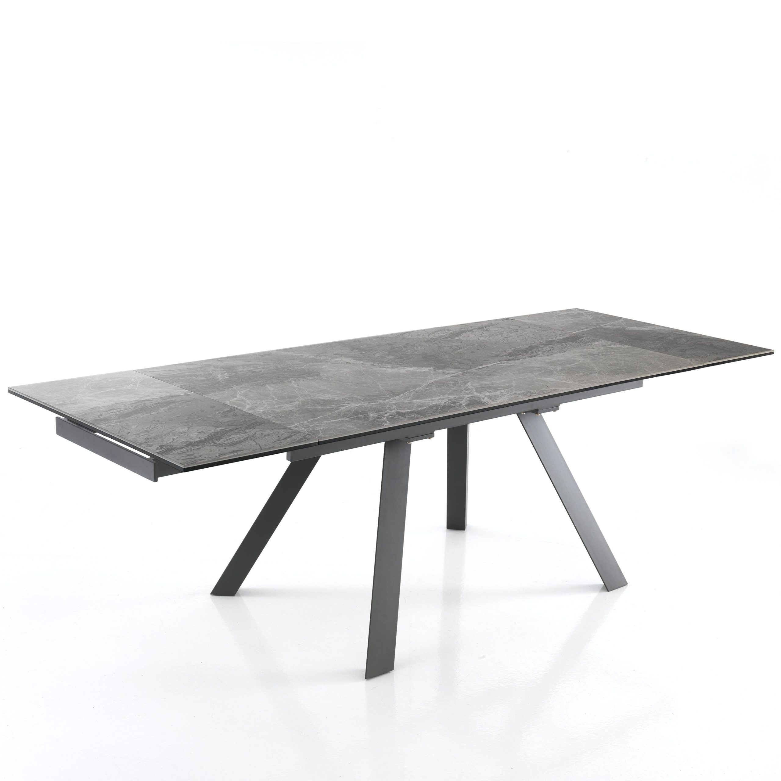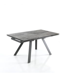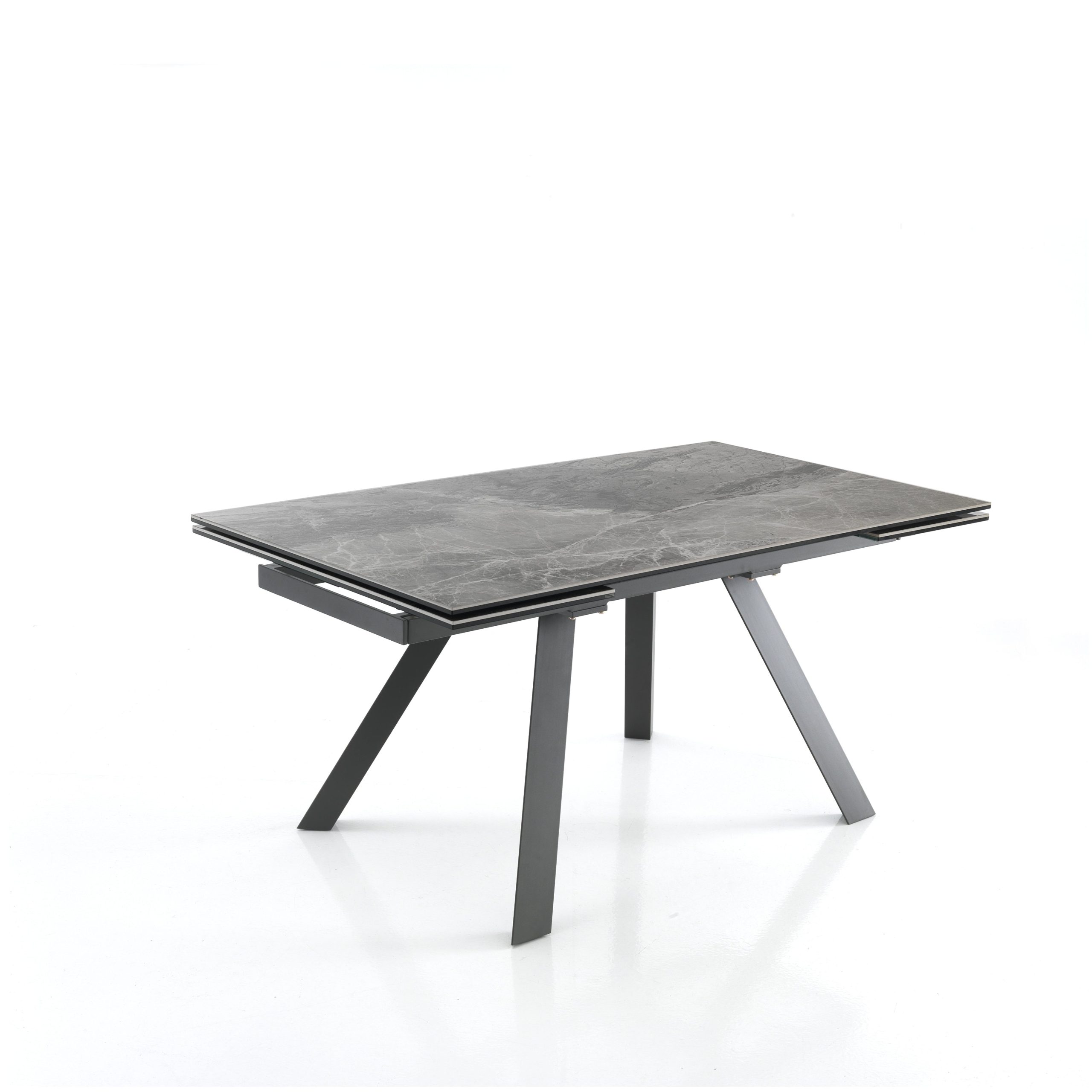 Tavolo allungabile da pranzo da cm 160, dalle notevoli doti qualitative, estetiche e funzionali. Infatti, emerge il piano con incantevole effetto marmo realizzato in vetro e ceramica, estensibile grazie a due allunghe di cm 40 ciascuna. Inoltre, le gambe dalla forma triangolare sono realizzate in metallo verniciato grigio e presentano una linea obliqua accentuata, conforme alle moderne tendenze.