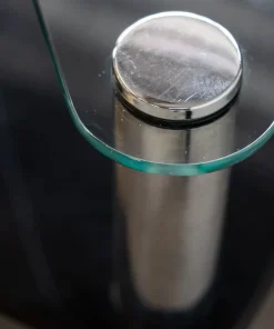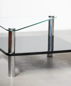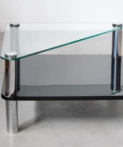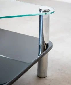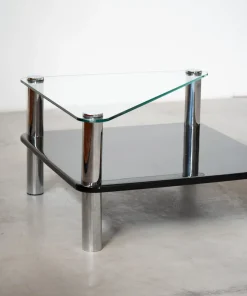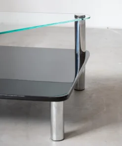 Coffee table “Zanuso”, uno dei MIGLIORI esempi dell’industrial design, è composto da due ripiani in cristallo e gambe in acciaio inox 18/8. Questo tavolo, nato come un mix ideale tra ricerca ed innovazione, è il risultato di una ricerca avanzata dell’industria automobilistica, fissando per la prima volta cristallo ed acciaio inox. L’idea nacque da Aurelio Zanotta, osservando i deflettori delle automobili: dei semplici nottolini incollati al cristallo. Decise poi di applicare il sistema alla sua produzione, affidando il compito al top degli architetti/designer dei tempi: Marco Zanuso, il quale trovò poi la soluzione per fissare le gambe di acciaio al piano in cristallo: semplicemente incollare direttamente sopra (con una tecnica senza precedenti, in cui la colla veniva polimerizzata con raggi UVA) 4 dischi di acciaio INOX, filettati al loro interno, e avvitarvi poi le gambe.