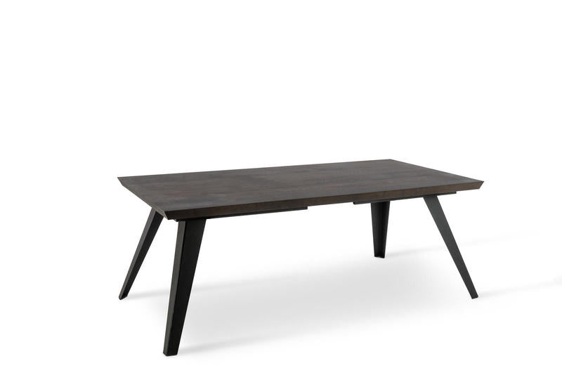 Tavolo moderno fisso ampio cm 200×100, un tavolo massiccio definito da un design trendy con gambe dalla linea obliqua realizzate in metallo. Il robusto piano si presenta in legno impiallacciato disponibile in due varianti rovere, ossia rovere naturale più chiaro o rovere termocotto più scuro. Anche le gambe dono disponibili in due versioni: colore nero o ruggine, entrambi colorazioni attuali che delineano uno stile dalle tendenze industrial.
