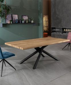 Tavolo da pranzo fisso ampio cm 200×100, indicato per chi desidera un piano spazioso e un tavolo imponente. Infatti, il nostro tavolo da salotto esibisce un piano spesso realizzato in legno in una finitura tradizionale come rovere naturale. Ma la peculiarità di questo tavolo si evidenzia nella base con gambe incrociate in metallo disponibile in nero o bianco.