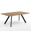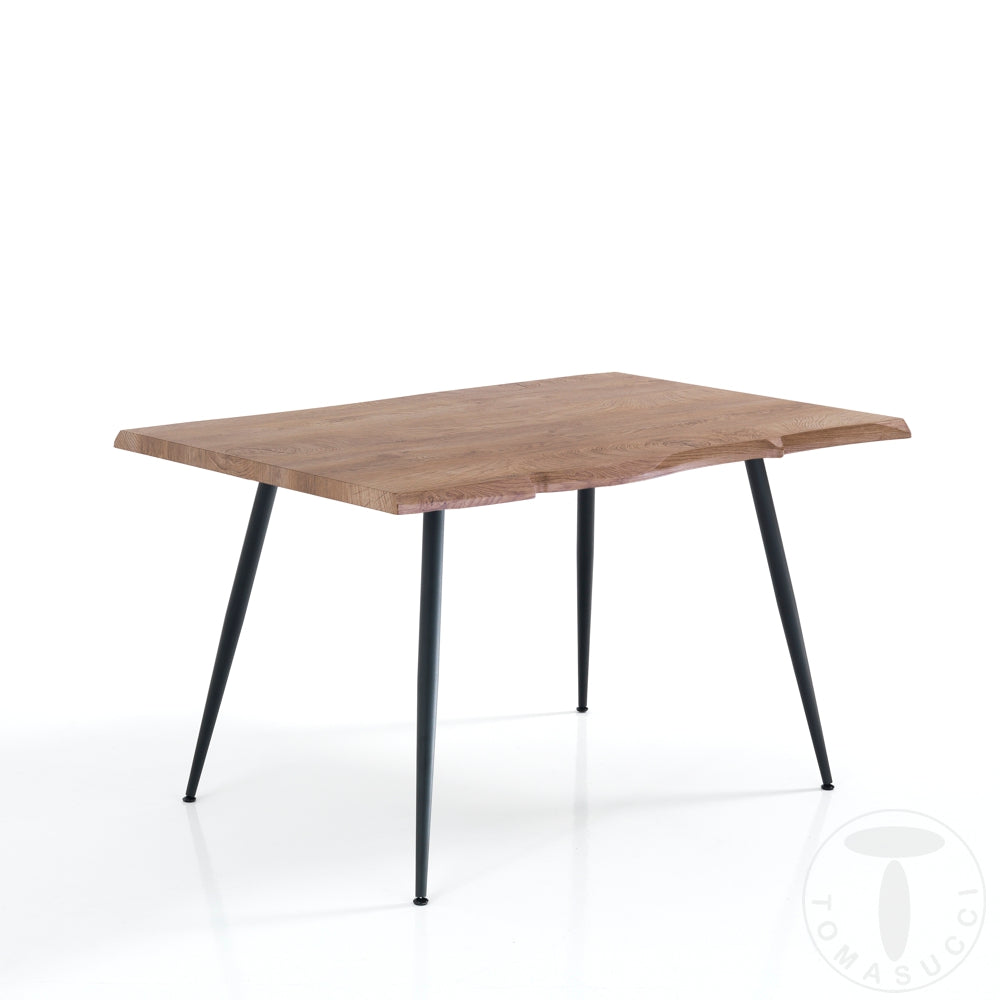 Tavolo moderno fisso costituto da elementi che producono un design singolare e fantasioso. Infatti, il nostro tavolo presenta il piano realizzato in legno colore quercia dal bordo irregolare con gambe in metallo colore nero. Il tavolo date le modeste dimensioni, si rende utile come tavolo da pranzo per ambienti piccoli, oppure da impiegare come scrivania per uno studio dall’arredo alternativo e particolare.