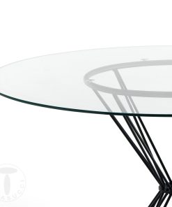 Elegante e sofisticato tavolo di design fisso di forma tonda, caratterizzato dalla bellissima base in metallo colore nero dal design contemporaneo. Il piano è realizzato in vetro trasparente, scelto appositamente per esaltare la modernità di stile e la raffinatezza di questo tavolo da salotto.