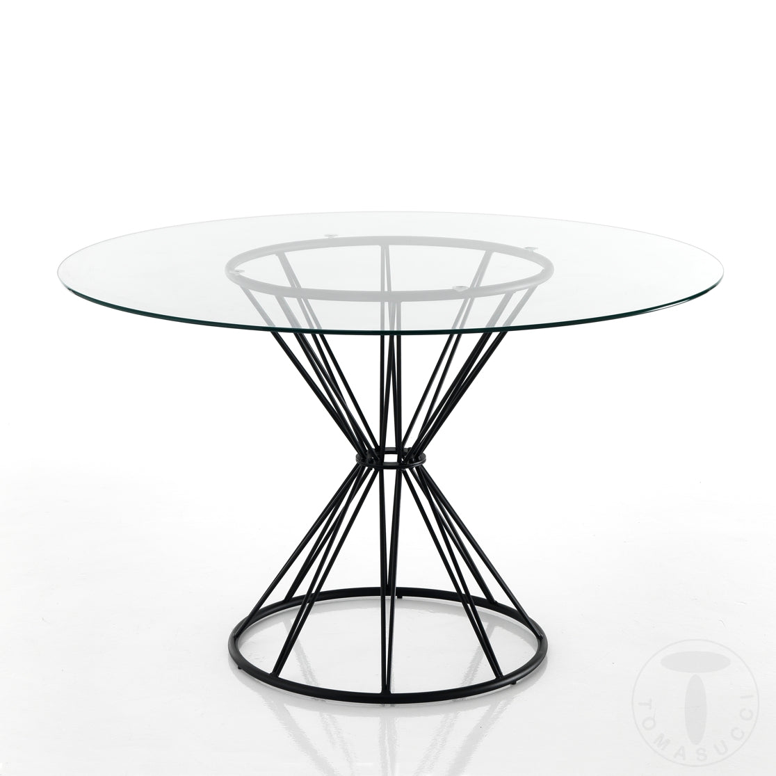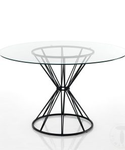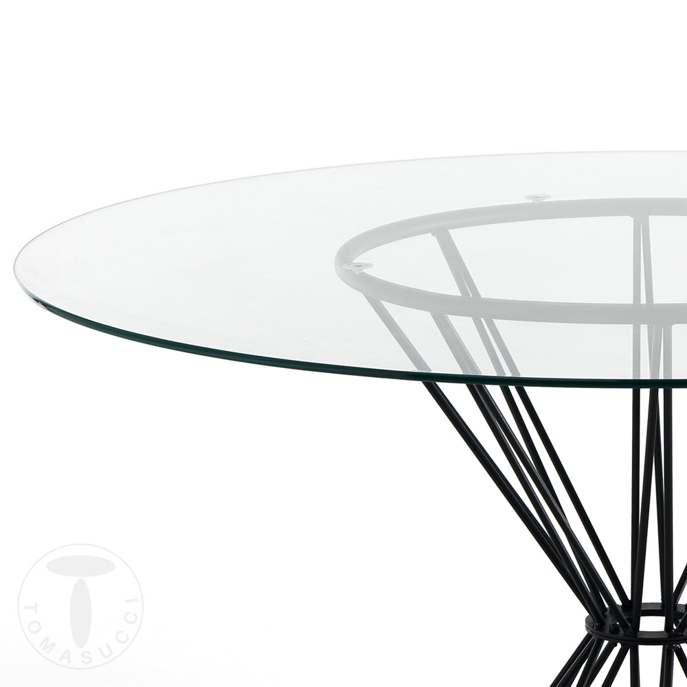 Tavolo tondo fisso realizzato in metallo colore nero e vetro trasparente, un’idea elegante per arredare il salotto puntando su uno stile minimale ma che non rinuncia alla ricercatezza.